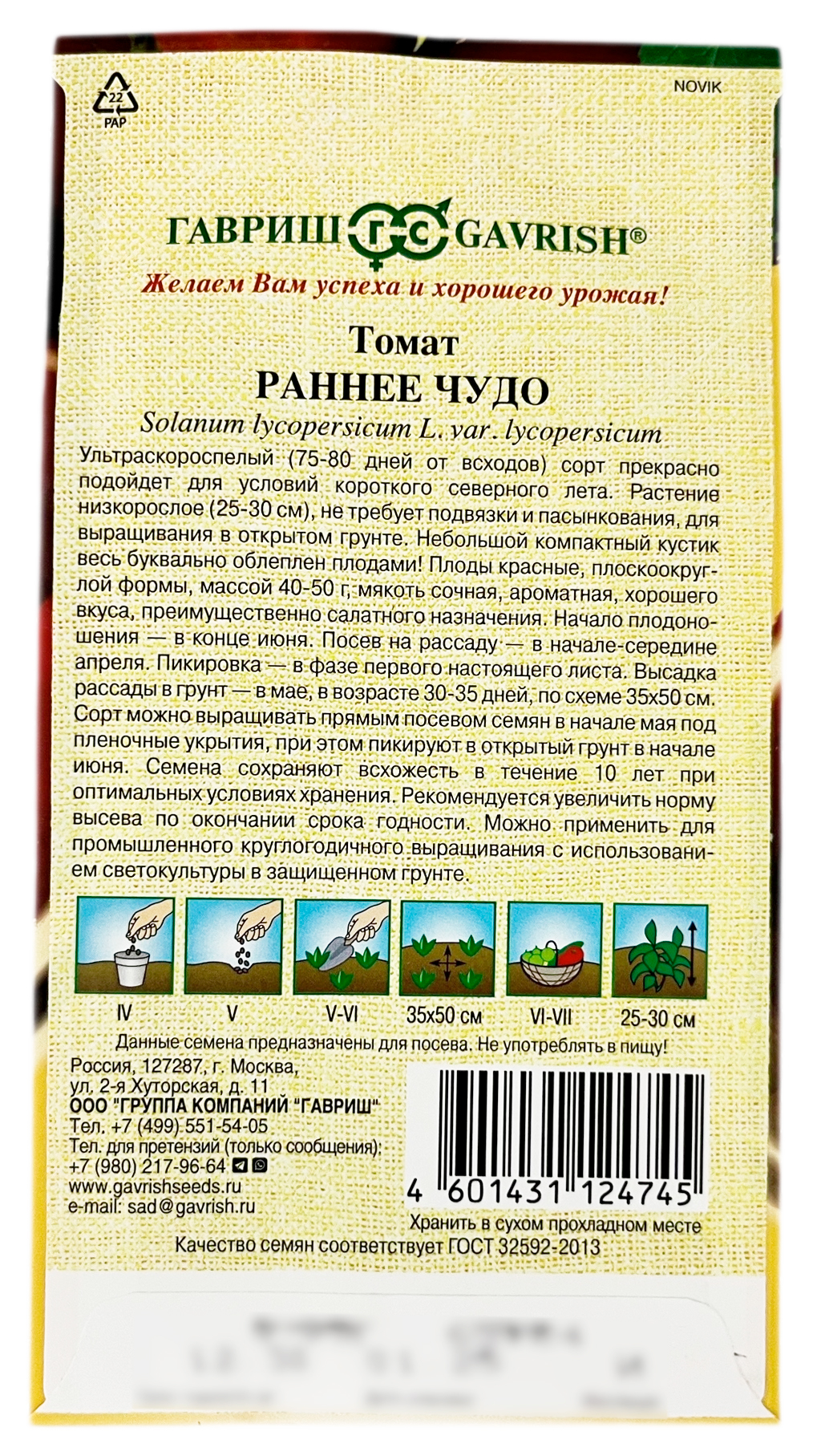 Томат РАННЕЕ ЧУДО ГАВРИШУльтраскороспелый (75-80 дней от всходов) сорт прекрасно подойдет для условий короткого северного лета! Растение низкорослое (25-30см) не требует подвязки и пасынкования, для выращивания в открытом грунте. Небольшой компактный кустик весь буквально облеплен плодами! Плоды красные, плоскоокруглой формы массой 40-50 г, мякоть сочная, ароматная, хорошего вкуса, преимущественно салатного назначения. Начало плодоношения — конец июня. Посев на рассаду — в начале-середине апреля. Пикировка — в фазе первого настоящего листа. Высадка рассады в грунт — в мае в возрасте 30-35 дней по схеме 35х50 см. Сорт можно выращивать прямым посевом семян в начале мая под пленочные укрытия, при этом пикируют в открытый грунт в начале июня. Семена сохраняют всхожесть в течение 10 лет при оптимальных условиях хранения. Рекомендуется увеличить норму высева по окончанию срока годности. Может применяться для промышленного круглогодичного выращивания с использованием светокультуры в защищенном грунте.
