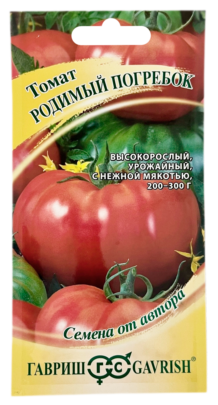 Томат РОДИМЫЙ ПОГРЕБОК ГАВРИШВысокорослый томат с выдающейся урожайностью. Рекомендуется для выращивания в пленочных и остекленных теплицах. Увесистые плоско-округлые плоды массой 200-300 г созревают на растении через 115 дней в кистях по 2-4 шт. С растения собирают до 1 ведра замечательных томатов с нежной мякотью и тонкой кожицей и используют их в салаты, для консервирования, приготовления лечо, пасты и соков. Посев на рассаду производят в конце марта-начале апреля. Пикировку — в фазе первого настоящего листа. Высадку рассады в грунт — после окончания весенних заморозков в возрасте 35-40 дней. Обязательна подвязка растений через несколько дней после высадки. Формируют в один стебель, удаляя все "пасынки" и нижние листья, а также прищипывают точку роста в конце вегетации. Схема посадки: 40х60 см.