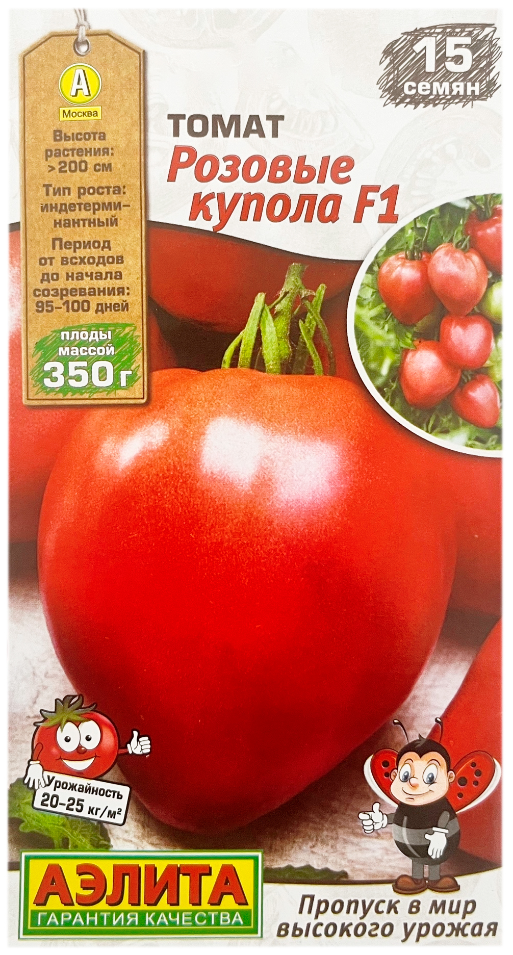 Томат РОЗОВЫЕ КУПОЛА F1 АЭЛИТАСладкий, салатный, розовый шедевр! Крупные, сахарные плоды в форме сердца – идеальное лакомство и украшение стола. Гибрид предназначен для пленочных теплиц в средней полосе и для открытого грунта в южных регионах (шпалерная культура). Раннеспелый, вступает в плодоношение через 95-100 суток от всходов. Растения индетерминантные, высокорослые. Кисти простые, 5-6 завязями. Плоды* многокамерные, массой 250-350 г.