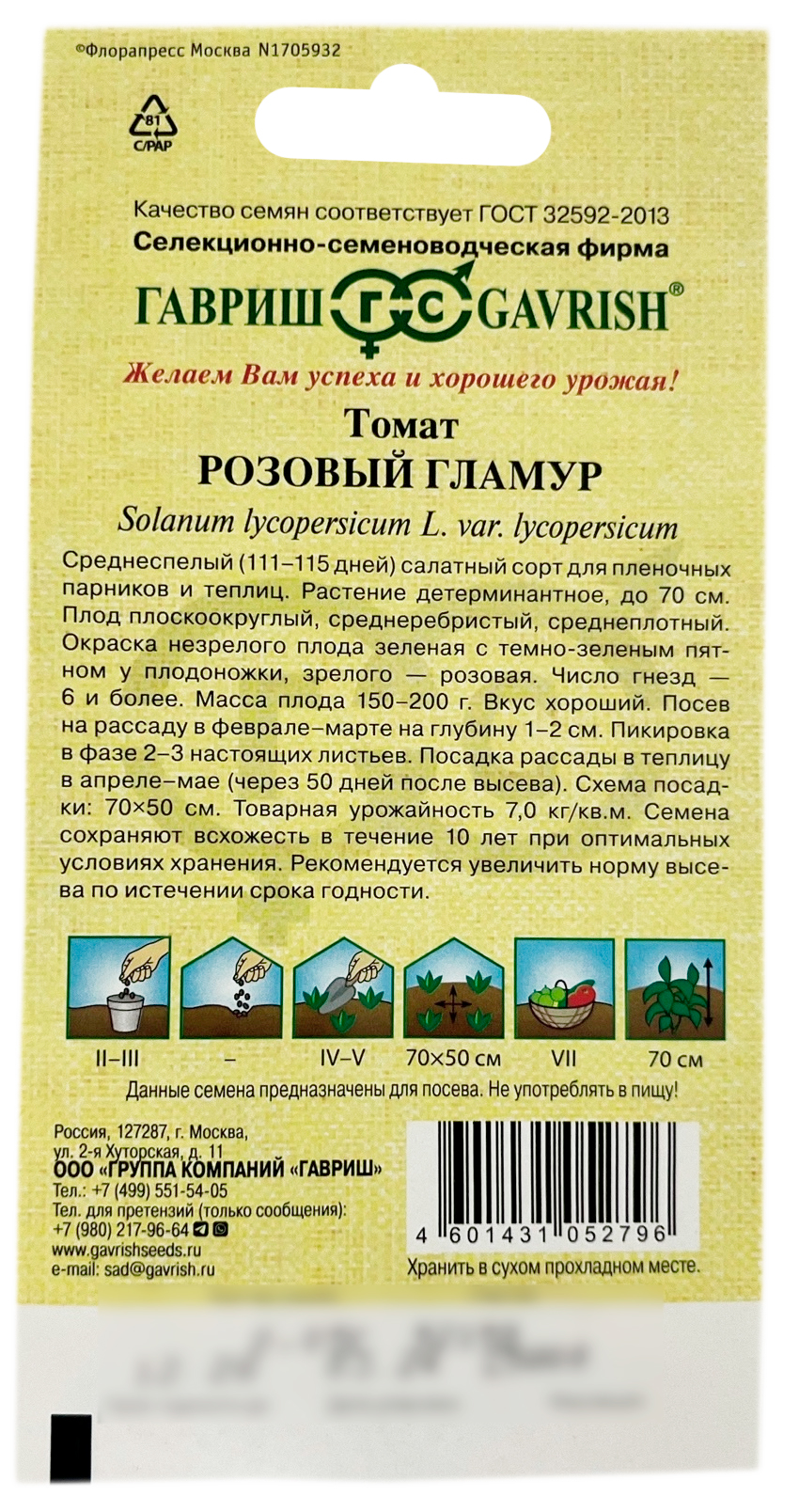 Томат РОЗОВЫЙ ГЛАМУР ГАВРИШСреднеспелый (111-115 дней) салатный сорт для пленочных парников и теплиц. Растение детерминантное, до 70 см. Плод плоскоокруглый, среднеребристый, среднеплотный. Окраска незрелого плода зеленая с темно-зеленым пятном у плодоножки, зрелого – розовая. Число гнезд шесть и более. Масса плода 150-200 г. Вкус хороший. Посев на рассаду в феврале-марте на глубину 1-2 см. Пикировка в фазе 2-3 настоящих листьев. Посадка рассады в теплицу в апреле–мае (через 50 дней после высева). Схема посадки: 70х50 см. Товарная урожайность 7,0 кг/кв.м.