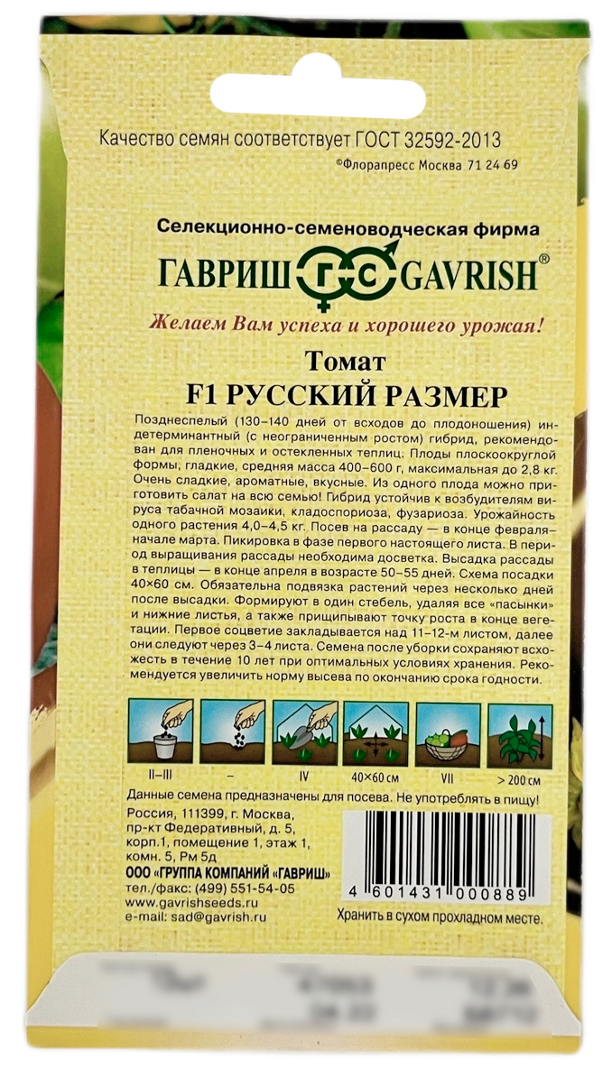 Томат РУССКИЙ РАЗМЕР ГАВРИШСреднепоздний (130-140 дней от всходов до плодоношения) индетерминантный (с неограниченным ростом) гибрид, рекомендован для пленочных и остекленных теплиц. Посев на рассаду в конце февраля – начале марта. Пикировка в фазе первого настоящего листа. В период выращивания рассады необходима досветка. Высадка рассады в теплицы в конце апреля в возрасте 50-55 дней. Обязательна подвязка растений через несколько дней после высадки. Первое соцветие закладывается над 11-12-м листом, далее они следуют через 3-4 листа. Формируют в один стебель, удаляя все «пасынки» и нижние листья, а так же прищипывают точку роста в конце вегетации. Плоды плоскоокруглой формы, гладкие, средняя масса 400-600 г, максимальная до 2,8 кг. Очень сладкие, ароматные, вкусные. Из одного плода можно приготовить салат на всю семью! Схема посадки 40х60 см. Гибрид устойчив к возбудителям вируса табачной мозаики, кладоспориоза, фузариоза. Урожайность одного растения 4,0-4,5 кг.