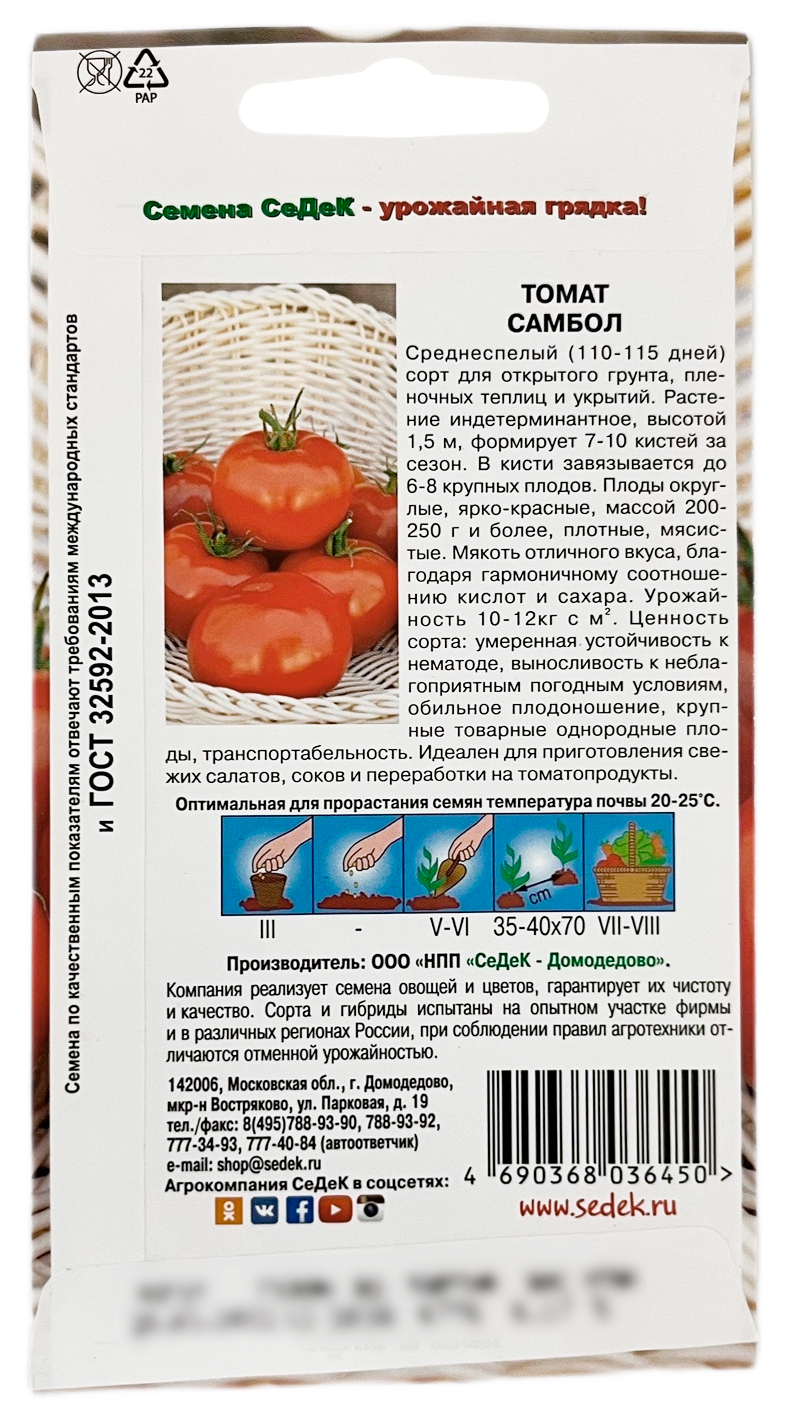 Томат САМБОЛ СеДеКСреднеспелый (110-115 дней) сорт для открытого грунта, пленочных теплиц и укрытий. Растение индетерминантное, высотой 1,5 м, формирует 7-10 кистей за сезон. В кисти завязывается до 6-8 крупных плодов. Плоды округлые, ярко-красные, массой 200-250 г и более, плотные, мясистые. Мякоть отличного вкуса, благодаря гармоничному соотношению кислот и сахара. Урожайность 10-12кг с м/2. Ценность сорта: умеренная устойчивость к нематоде, выносливость к неблагоприятным погодным условиям, обильное плодоношение, крупные товарные однородные плоды, транспортабельность. Идеален для приготовления свежих салатов, соков и переработки на томатопродукты.