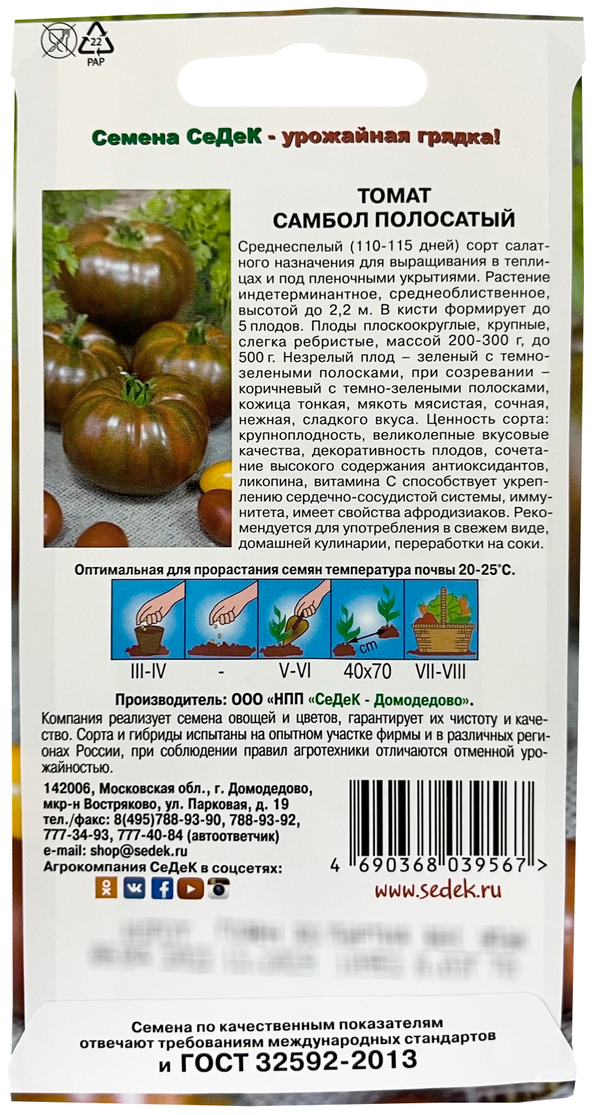 Томат Самбол Полосатый СеДеКСреднеспелый (110-115 дней) сорт салатного назначения для выращивания в теплицах и под пленочными укрытиями. Растение индетерминантное, среднеоблиственное, высотой до 2,2 м. В кисти формирует до 5 плодов. Плоды плоскоокруглые, крупные, слегка ребристые, массой 200-300 г, до 500 г. Незрелый плод – зеленый с темно-зелеными полосками, при созревании – коричневый с темно-зелеными полосками, кожица тонкая, мякоть мясистая, сочная, нежная, сладкого вкуса. Ценность сорта: крупноплодность, великолепные вкусовые качества, декоративность плодов, сочетание высокого содержания антиоксидантов, ликопина, витамина С способствует укреплению сердечно-сосудистой системы, иммунитета, имеет свойства афродизиаков. Рекомендуется для употребления в свежем виде, домашней кулинарии, переработки на соки.