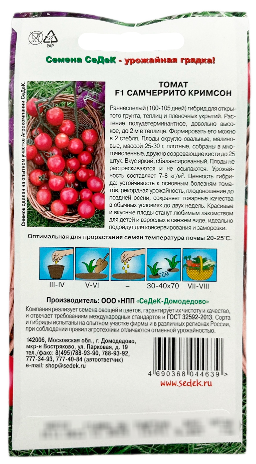 Томат Самчеррито Кримсон F1 СеДеКРаннеспелый (100-105 дней) гибрид для открытого грунта, теплиц и пленочных укрытий. Растениеполудетерминантное, довольно высокое, до 2 м в теплице. Формировать его можно в 2 стебля. Плоды округло-овальные, малиновые, массой 25-30 г, плотные, собраны в многочисленные, дружно созревающие кисти до 25 штук. Вкус яркий, сбалансированный. Плоды не растрескиваются и не осыпаются. Урожайность составляет 7-8 кг/м2. Ценность гибрида: устойчивость к основным болезням томатов, рекордная урожайность, плодоношение до поздней осени, сохраняет товарные качества в обычных условиях до двух недель. Красивые и вкусные плоды станут любимым лакомством для детей и взрослых в свежем виде, идеально подойдут для консервирования и заморозки.