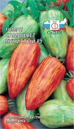 Среднеспелый (от всходов до начала созревания плодов 110-115 дней) гибрид для выращивания в открытом (на шпалерах) и защищенном грунте. Растение индетерминантное, высотой 2 м, в кисти 8-12 плодов. Плоды удлиненно-овальные, со слегка заостренным кончиком, массой 25-45 г, оригинальной окраски: красные с оранжевыми полосками, двухкамерные, с высокими вкусовыми качествами и высоким содержанием витаминов. Ценность гибрида: устойчивость к болезням и неблагоприятным погодным условиям. Рекомендуется для употребления в свежем виде и цельноплодного консервирования.Характеристики