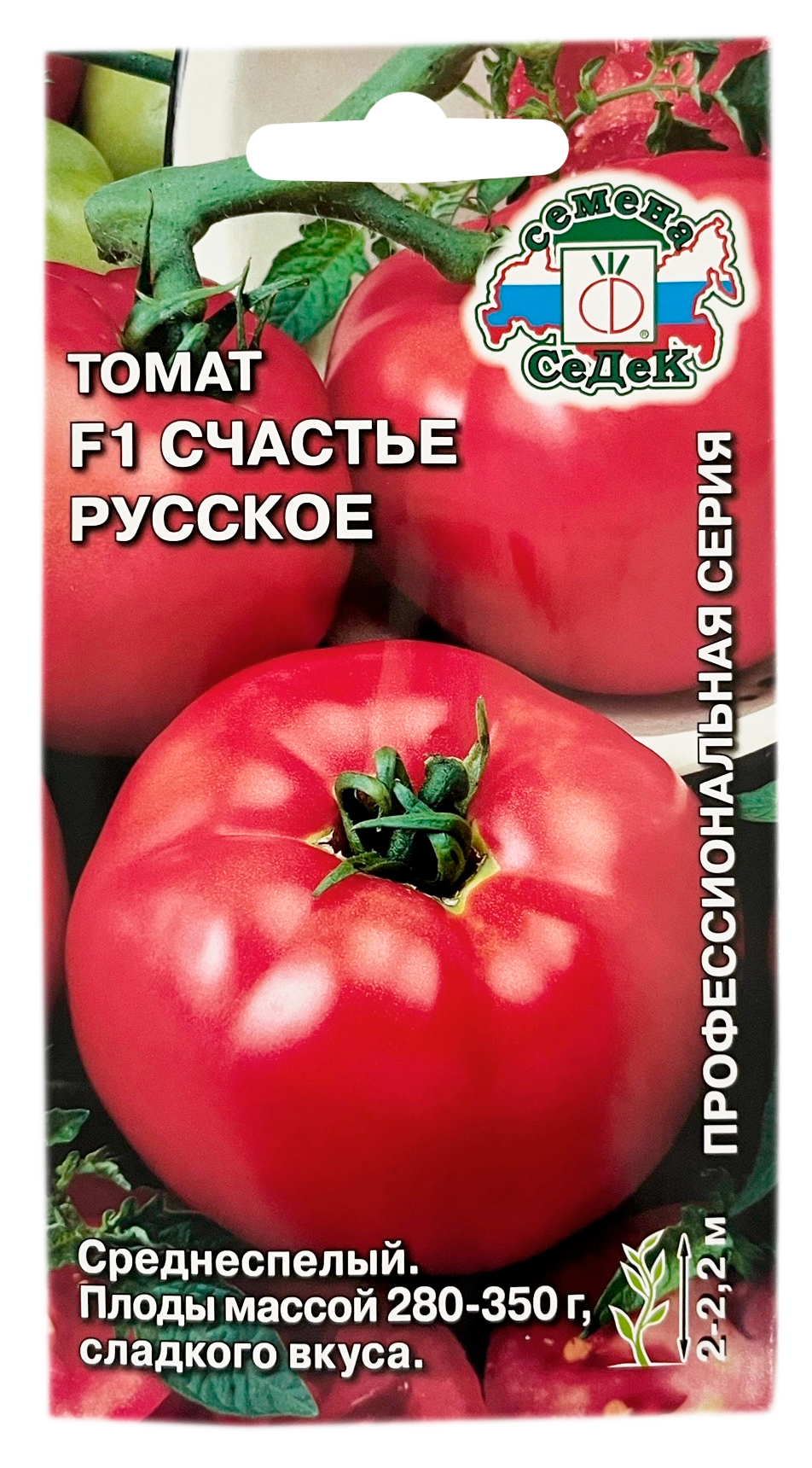 Томат Счастье Русское F1 СеДеКСреднеспелый (105-115 дней) гибрид для защищенного грунта. Растение индетерминантное, высотой 2-2,2 м, среднеоблиственное, с мощным стеблем и укороченными междоузлиями. Плоды выравненные, плоскоокруглые, плотные, в технической спелости – зеленые, в биологической – ярко-розовые, массой 280-350 г, мясистые, сочные, сладкого вкуса. Ценность гибрида: устойчивость к альтернариозу, фузариозу, вирусу табачной мозаики, длительно сохраняет товарные качества плодов на корню и при транспортировке. Отзывчив к высокому уровню питания и поливу. Рекомендуется для употребления в свежем виде, приготовления соков и переработки.