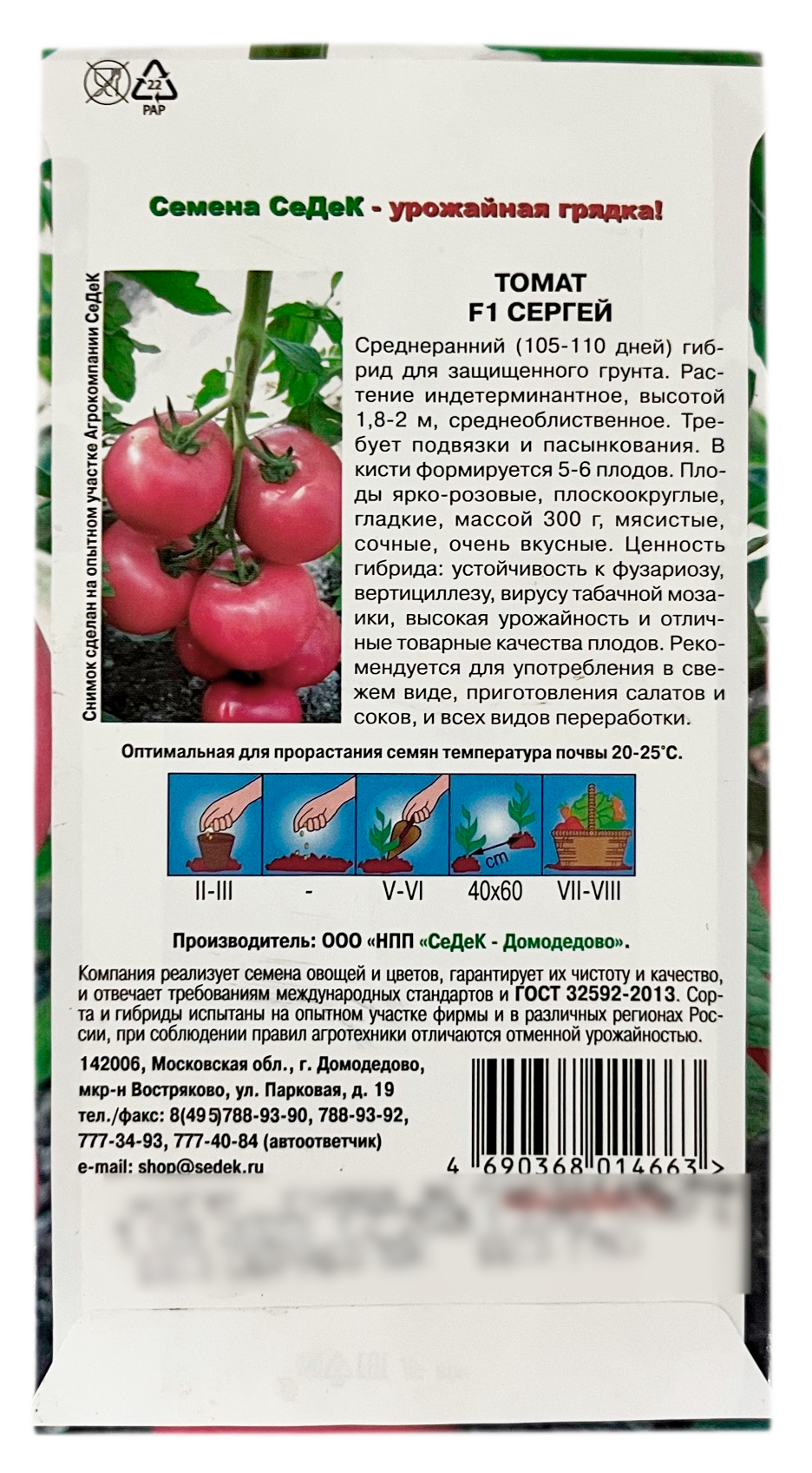 Томат F1 СЕРГЕЙ СеДеКСреднеранний (105-110 дней) гибрид для защищенного грунта. Растение индетерминантное, высотой 1,8-2 м, среднеоблиственное. Требует подвязки и пасынкования. В кисти формируется 5-6 плодов. Плоды ярко-розовые, плоскоокруглые, гладкие, массой 300 г, мясистые, сочные, очень вкусные. Ценность гибрида: устойчивость к фузариозу, вертициллезу, вирусу табачной мозаики, высокая урожайность и отличные товарные качества плодов. Рекомендуется для употребления в свежем виде, приготовления салатов и соков, и всех видов переработки.