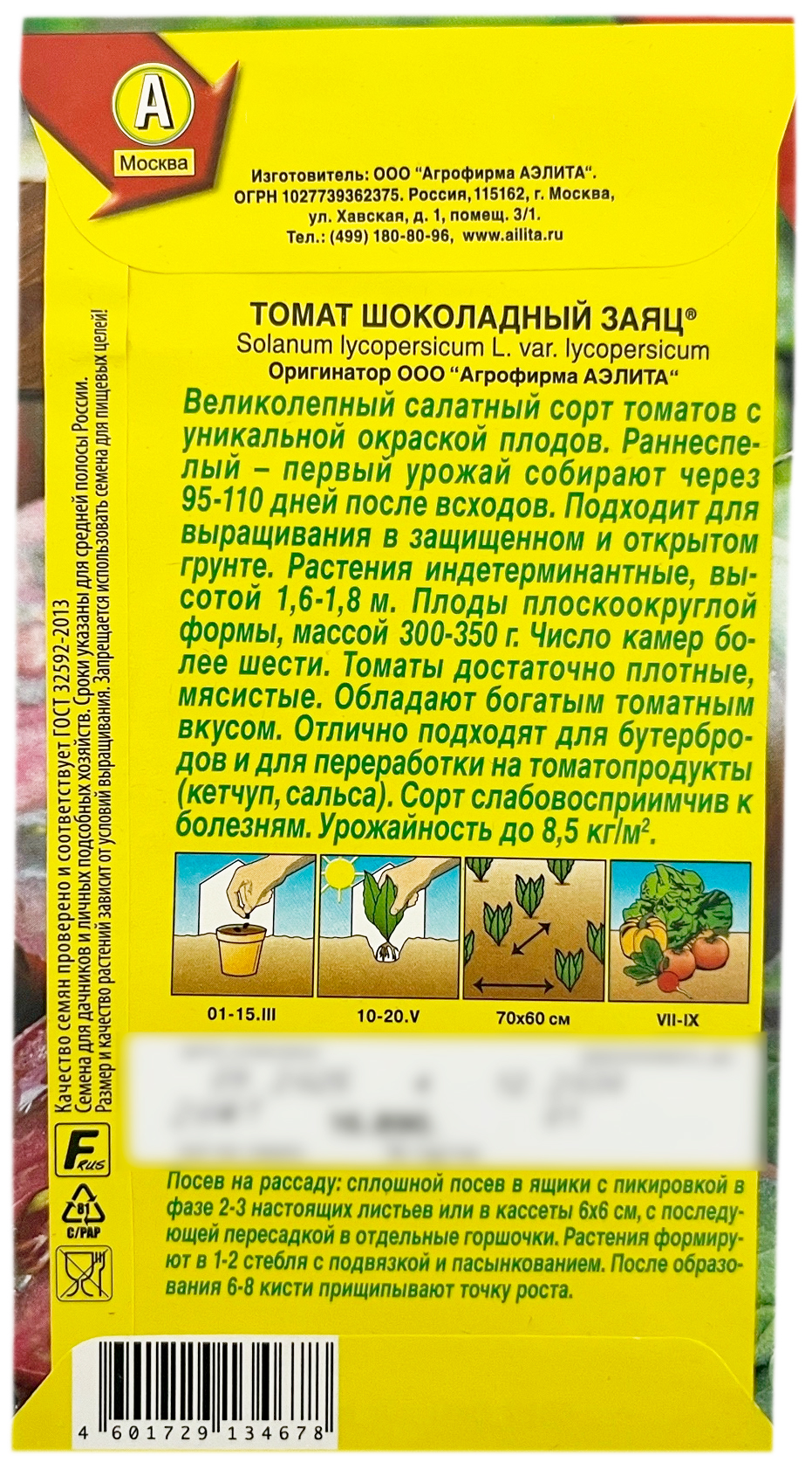 Томат ШОКОЛАДНЫЙ ЗАЯЦ АЭЛИТАВеликолепный салатный сорт томатов с уникальной окраской плодов. Раннеспелый – первый урожай собирают через 95-110 дней после всходов. Подходит для выращивания в защищенном и открытом грунте. Растения индетерминантные, высотой 1,6-1,8 м. Плоды плоскоокруглой формы, массой 300-350 г. Число камер более шести. Окраска незрелого плода – зеленая с более темным пятном. Томаты достаточно плотные, мясистые. Обладают богатым томатным вкусом, терпкие, не кислые. Отлично подходят для бутербродов и для переработки на томатопродукты (кетчуп, сальса). Сорт слабовосприимчив к болезням.
