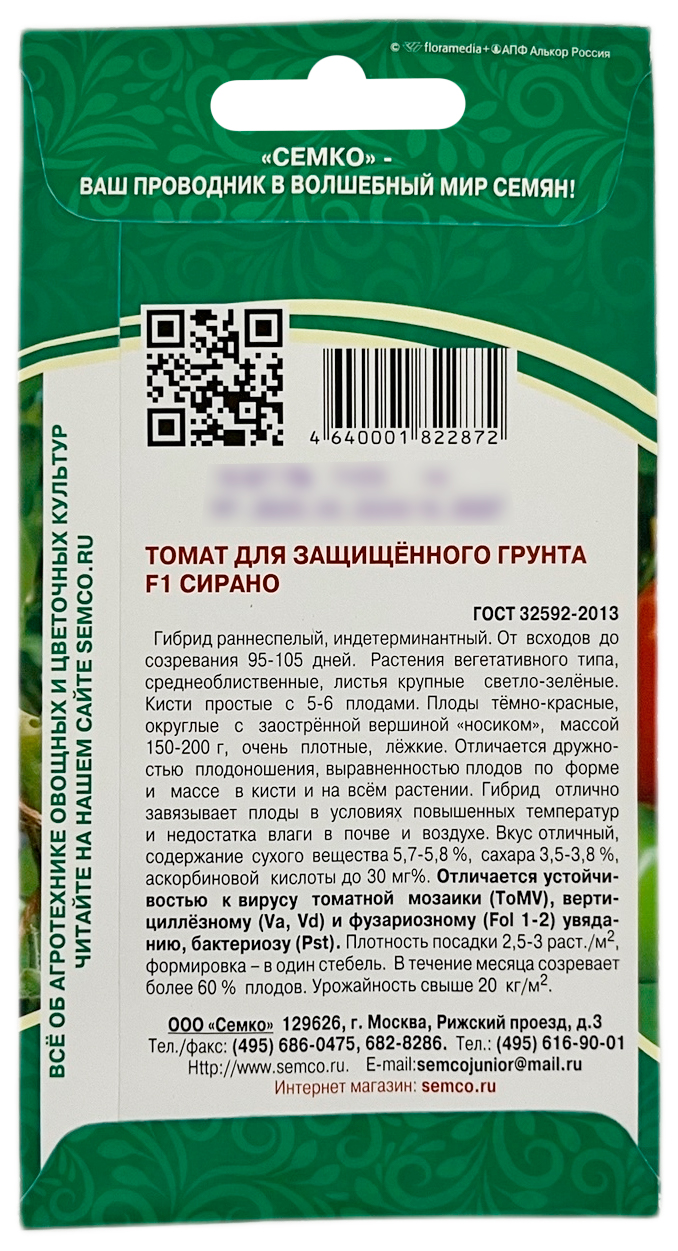 Томат СИРАНО СЕМКОРанний, индетерминантный гибрид. От всходов до созревания 95-105 дней. Растения вегетативного типа, среднеоблиственные, листья крупные светло-зелёные. Кисти простые с 5-6 плодами. Помидоры тёмно-красные, округлые с заострённой вершиной «носиком», массой 150-200 г, очень плотные, лёжкие. Отличается дружностью плодоношения, выравненностью плодов по форме и массе в кисти и на всём растении. Гибрид отлично завязывает плоды в условиях повышенных температур и недостатка влаги в почве и воздухе. Вкус отличный, содержание сухого вещества 5,7-5,8 %, сахара 3,5-3,8 %, аскорбиновой кислоты до 30 мг%. Томат Сирано F1 отличается устойчивостью к вирусу томатной мозаики (ToMV), вертициллёзному (Va, Vd) и фузариозному (Fol 1-2) увяданию, кладоспориозу (Ff), и чёрной бактериальной пятнистости (Pst). Плотность посадки 2,5-3 раст./м2, формировка – в один стебель. В течение месяца созревает более 60% плодов. Урожайность свыше 20 кг/м2.