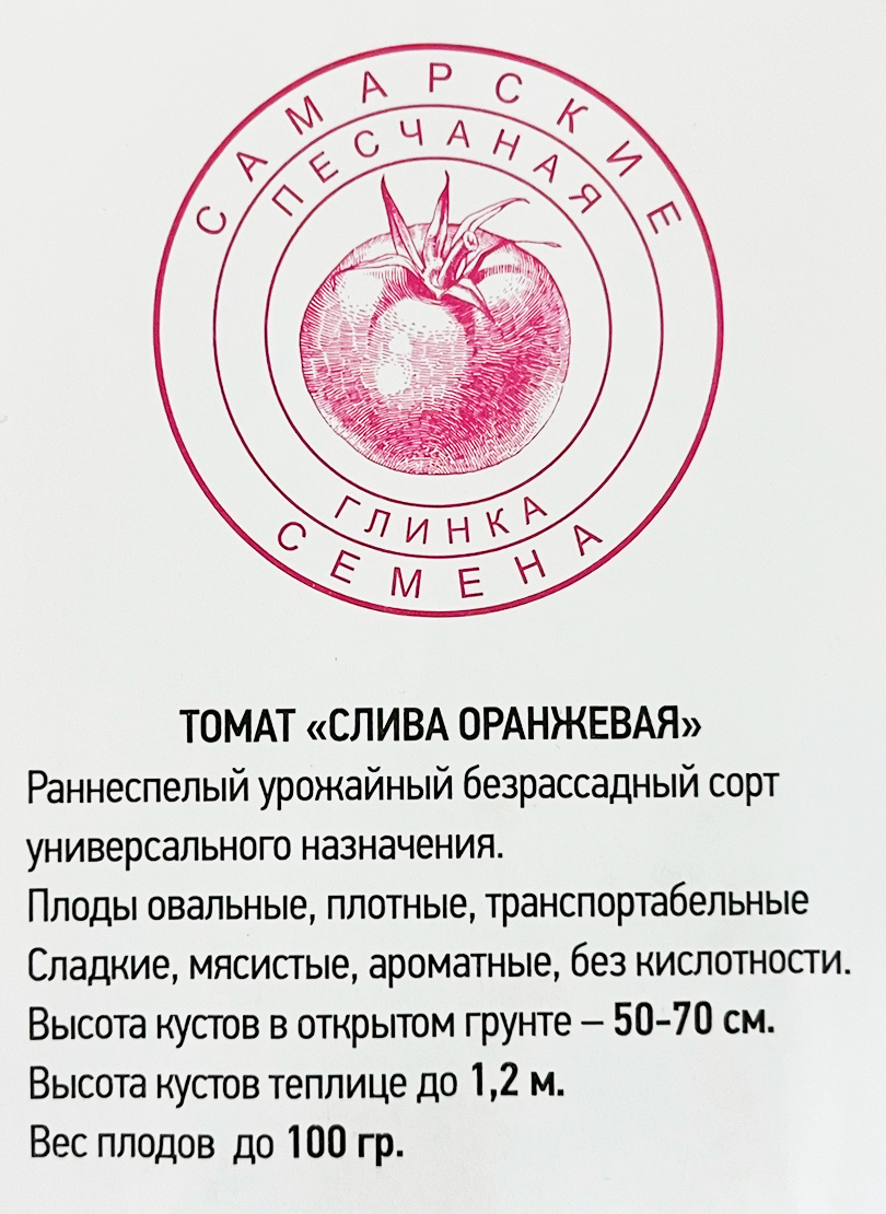 Томат Слива оранжеваяРаннеспелый урожайный безрассадный сорт универсального назначения. Плоды овальные, плотные, транспортабельные. Сладкие, мясистые, ароматные, без кислотности.