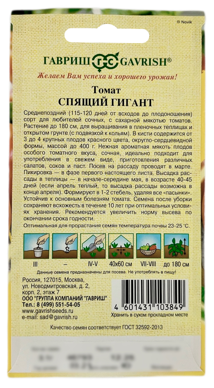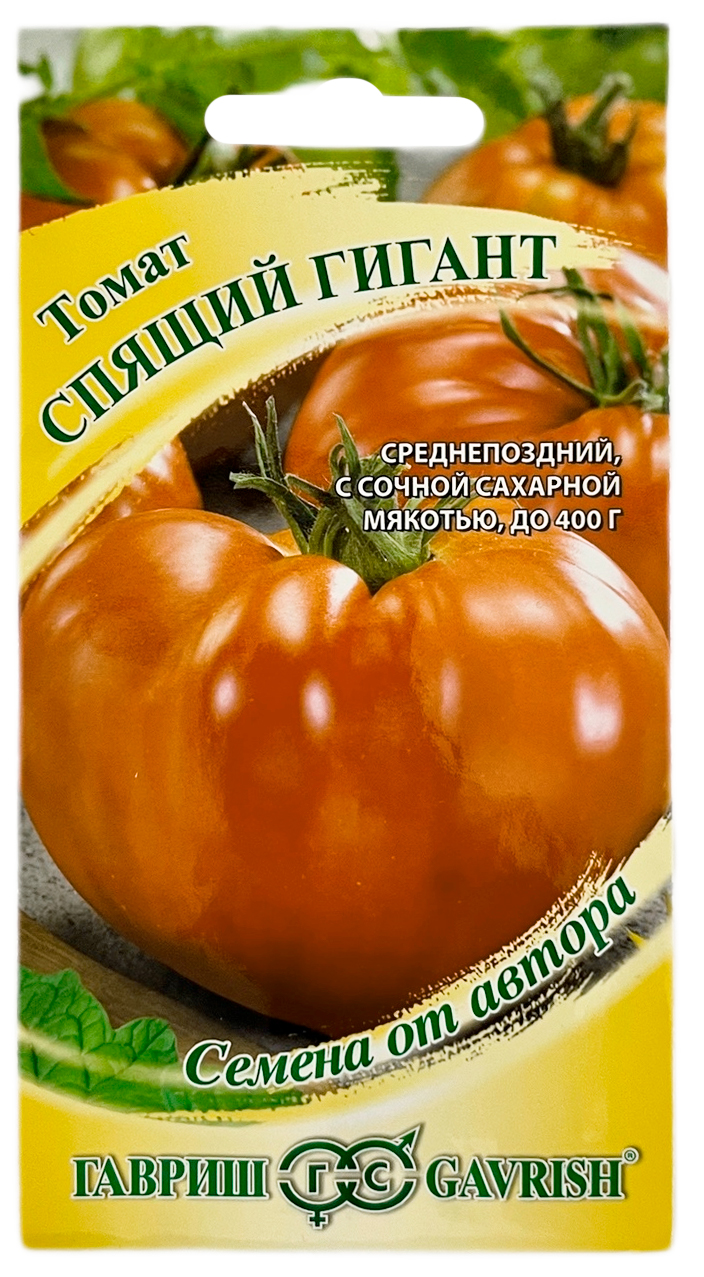 Томат СПЯЩИЙ ГИГАНТ ГАВРИШСреднепоздний (115-120 дней от всходов до плодоношения) сорт для любителей сочных с сахарной мякотью томатов. Растение высокорослое (до 180 см), для выращивания в пленочных теплицах и открытом грунте (с подвязкой к кольям). В кисти содержится от 3 до 4 крупных плодов красного цвета округлой-сердцевидной формы, массой до 400 г. Нежная, ароматная мякоть плодов особого томатного вкуса, сладкая, сочная, идеально подходит для употребления в свежем виде, приготовления различных салатов, соков и паст. Посев на рассаду проводят в марте. Пикировка — в фазе первого настоящего листа. Высадка рассады в теплицы — в начале-середине мая в возрасте 40-45 дней (если апрель теплый, то высадка рассады возможна в конце апреля). Формируют в 1-2 стебля, удаляя все «пасынки». Устойчив к основным болезням томата. Семена после уборки сохраняют всхожесть в течение 10 лет при оптимальных условиях хранения. Рекомендуется увеличить норму высева по окончании срока годности.