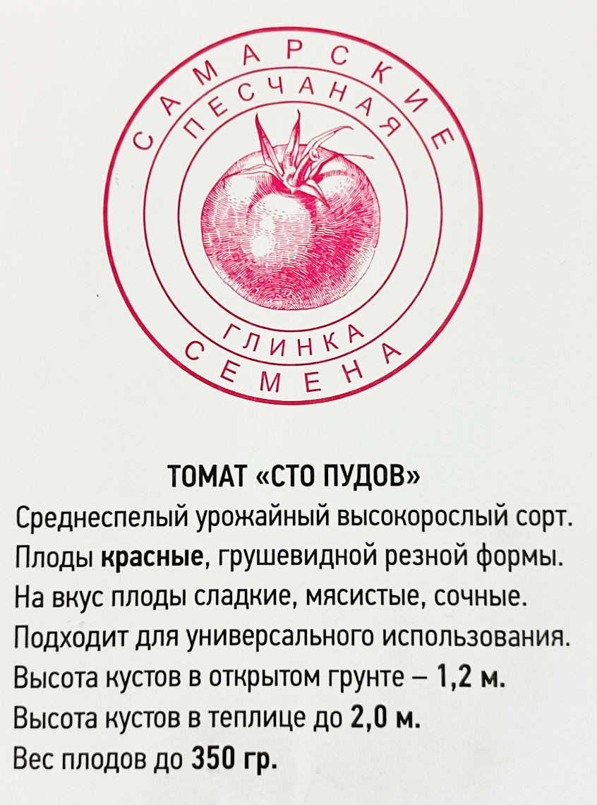 Томат СТО ПУДОВ – сорт с мясистыми, крупными плодами оригинальной формы. Урожайный, с продолжительным периодом плодоношения.В открытом грунте высота кустов 1-1,2 м, в теплицах 1,5-2 м. Томаты массой 200-300 г, некоторые вырастают до 500 г. Запоминаются своей сладостью, сочностью и нежностью.