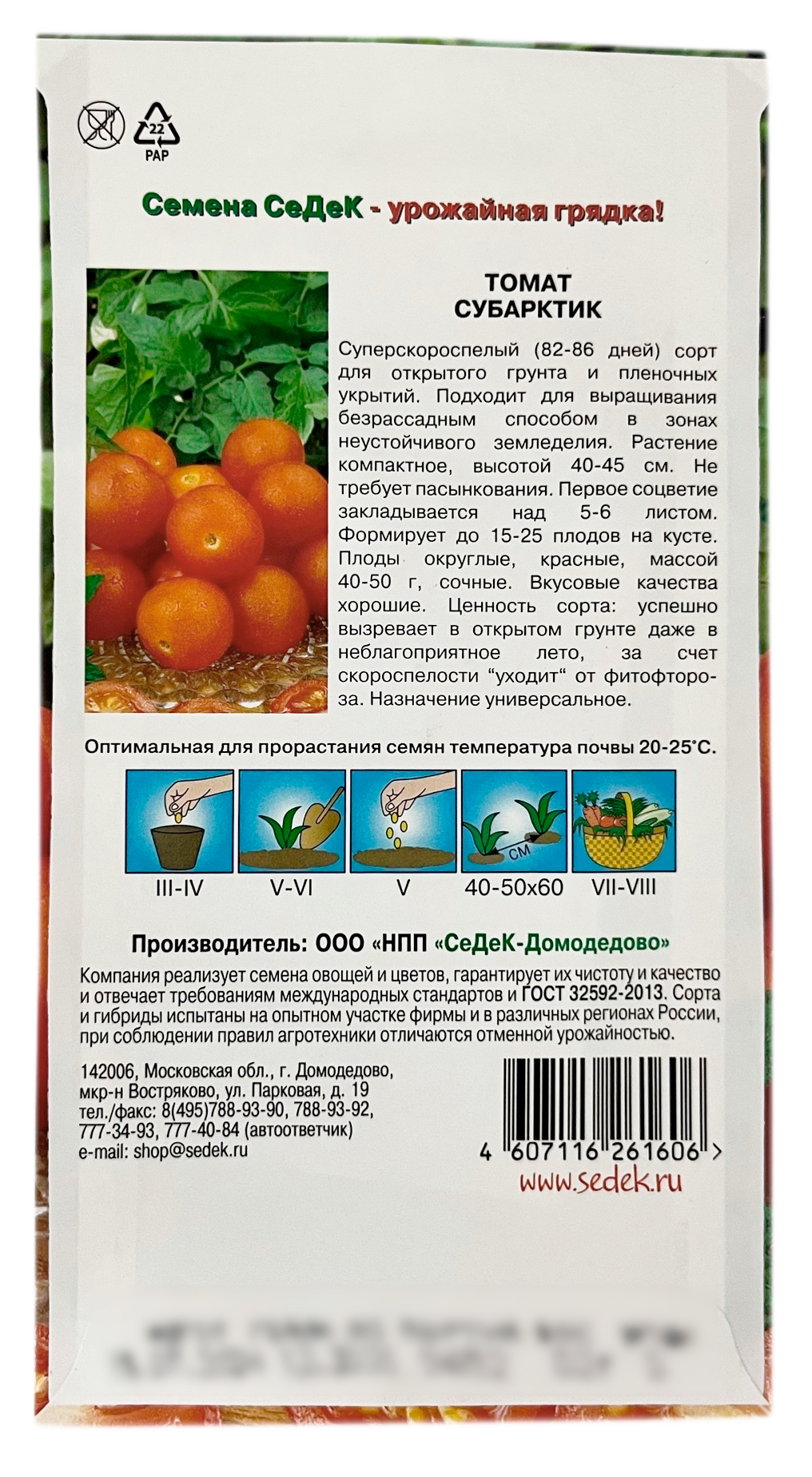 Томат СУБАРКТИК СеДеКСуперскороспелый (82-86 дней) сорт для открытого грунта и пленочных укрытий. Подходит для выращивания безрассадным способом в зонах неустойчивого земледелия. Растение компактное, высотой 40-45 см. Не требует пасынкования. Первое соцветие закладывается над 5-6 листом. Формирует до 15-25 плодов на кусте. Плоды округлые, красные, массой 40-50 г, сочные. Вкусовые качества хорошие. Ценность сорта: успешно вызревает в открытом грунте даже в неблагоприятное лето, за счет скороспелости “уходит“ от фитофтороза. Назначение универсальное.