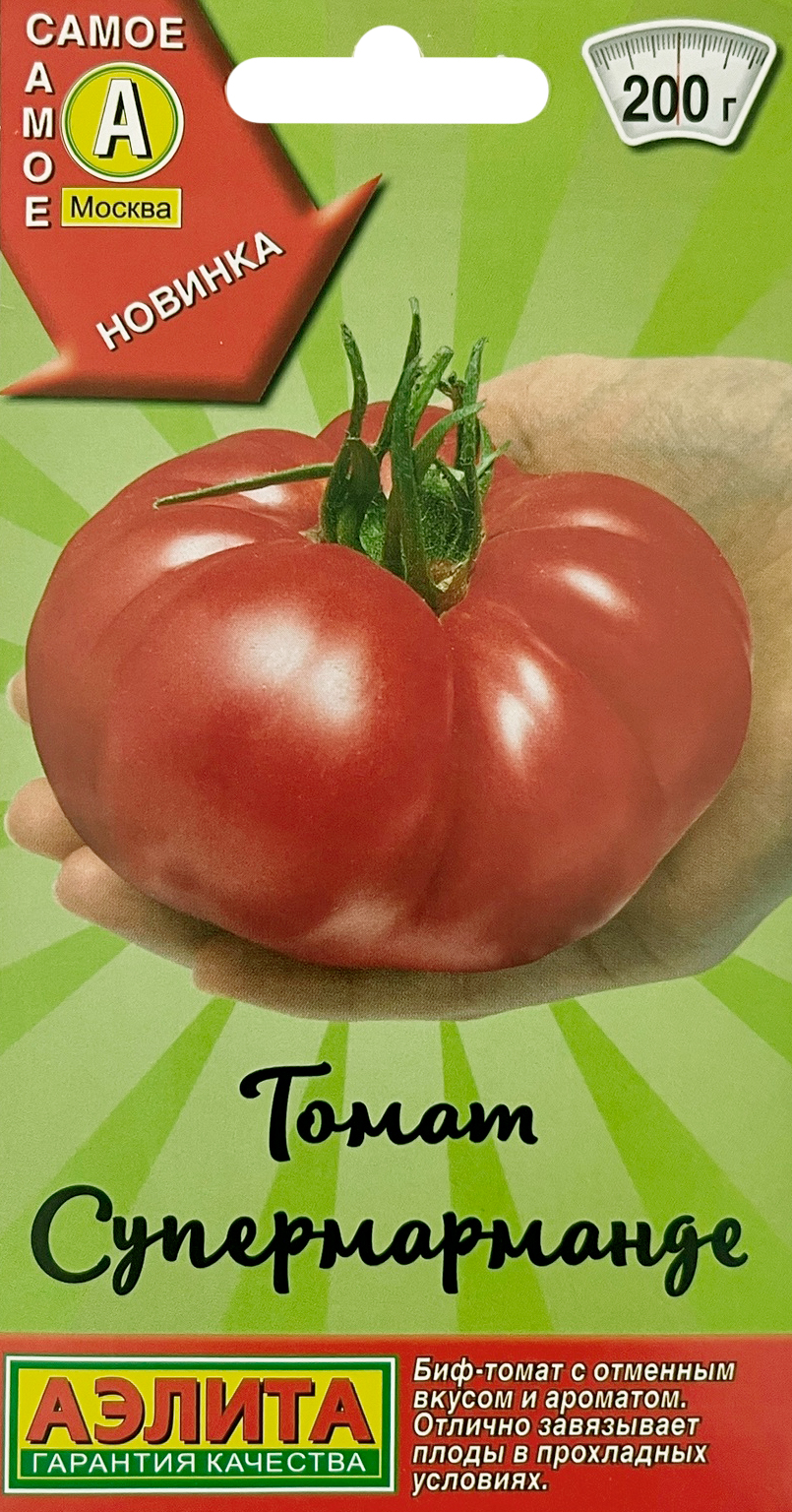 Томат СупермармандеОтличный биф-томат европейской селекции. Для выращивания в открытом и защищенном грунте. Отлично завязывает плоды в прохладных погодных условиях. Сорт раннего срока созревания – от всходов до начала сбора плодов 95-100 дней. Растение полудетерминантное, в теплице вырастает около 1,5 м. Плоды* многокамерные плотные, с небольшим количеством семян, массой 160-200 г. Вкус очень сладкий и нежный с выраженным томатным ароматом. Томат широко используется в кулинарии. Урожайность в теплице – 10-12 кг/м2.