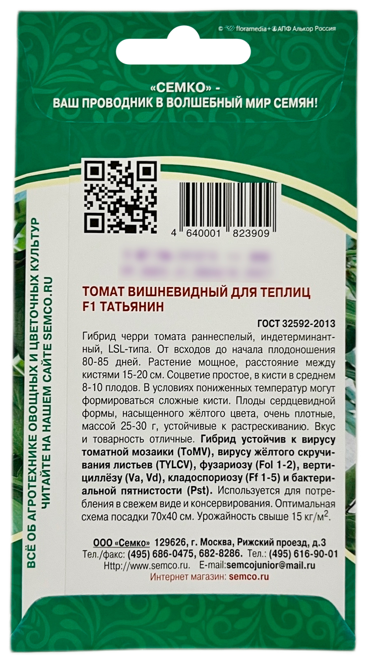 Томат ТАТЬЯНИН СЕМКОРанний кистевой гибрид для теплиц и открытого грунта, индетерминантный, LSL типа. От всходов до начала плодоношения 80–85 дней. Растение мощное, расстояние между кистями 15-20 см. Соцветие простое , в кисти в среднем 8-10 помидоров. В условиях пониженных температур могут формироваться сложные кисти. Плод томата сердцевидной формы , насыщенного-желтого цвета , очень плотный , массой 25-30 г, устойчив к растрескиванию. Вкус и товарность помидоров отличные. Томат Татьянин F1 устойчив к вирусам томатной мозаики (TоMV), желтого скручивания листьев (TYLCV), вертициллезу (Va, Vd), фузариозу (Fol1–2), кладоспориозу (Ff), и бактериальной пятнистости(Pst). Схема посадки 70х40 см. Урожайность свыше 15 кг/м2. Выращивание в открытом грунте обязательно с подвязкой к опоре.