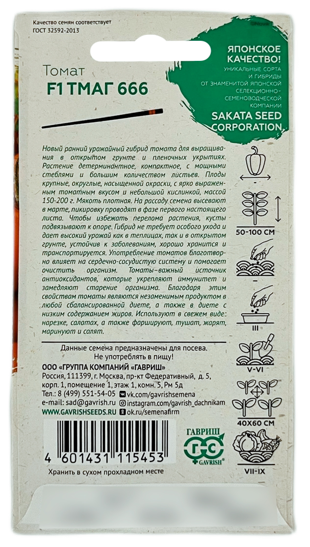 Томат ТМАГ 666 ГАВРИШ САКАТАНовый ранний, урожайный гибрид томата для выращивания в открытом грунте и пленочных укрытиях. Растение детерминантное, компактное, с мощными стеблями и большим количеством листьев. Плоды крупные, округлые, насыщенной окраски, с ярко выраженным томатным вкусом и небольшой кислинкой, массой 150-200 г. Мякоть плотная, сочная. На рассаду семена высевают в марте, пикировку проводят в фазе первого настоящего листа. Чтобы избежать перелома растения, кусты подвязывают к опоре. Гибрид не требует особого ухода и дает высокий урожай как в теплицах, так и в открытом грунте, устойчив к заболеваниям, хорошо хранится и транспортируется. Употребление томатов благотворно влияет на сердечно-сосудистую систему и помогает очистить организм. Томаты–важный источник антиоксидантов, которые укрепляют иммунитет и замедляют старение организма. Благодаря этим свойствам томаты являются незаменимым продуктом в любой сбалансированной диете, а также в диете с низким содержанием жиров. Используют в свежем виде: нарезке, салатах, а также фаршируют, тушат, жарят, маринуют и солят.