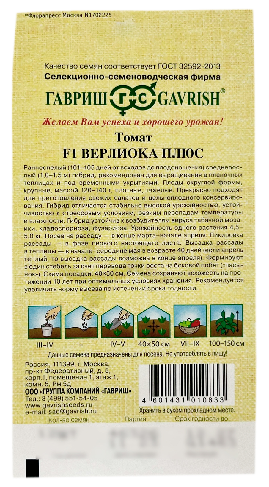 Томат Верлиока плюс F1 ГАВРИШРаннеспелый (101-105 дней от всходов до плодоношения) среднерослый (1,0-1,5 м) гибрид, рекомендован для выращивания в пленочных теплицах и под временными укрытиями. Посев на рассаду в конце марта – начале апреля. Пикировка рассады в фазе первого настоящего листа. Высадка рассады в теплицы в начале-середине мая в возрасте 40 дней (если апрель теплый, то высадка рассады возможна в конце апреля). Формируют в один стебель за счет перевода точки роста на боковой побег («пасынок»). Плоды округлой формы, крупные, массой 120-140 г, плотные, тяжелые. Прекрасно подходят для приготовления свежих салатов и цельноплодного консервирования. Гибрид отличается стабильно высокой урожайностью, устойчивостью к стрессовым условиям, резким перепадам температуры и влажности.