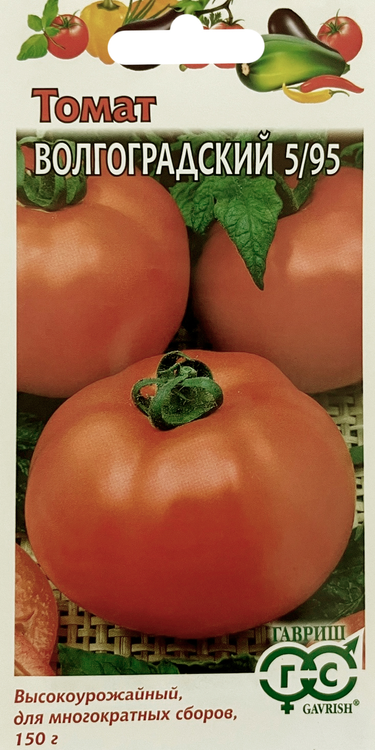 Томат Волгоградский 5/95Высокоурожайный сорт, от полных всходов до созревания 116 дней. Рекомендован для выращивания в открытом грунте, тоннелях и пленочных теплицах. Растение среднерослое, компактное, высотой 70-100 см. После высадки в открытый грунт растения, формируют в 2-3 стебля. Плоды красные, плоскоокруглые, слаборебристые, мясистые, с высоким содержанием сухого вещества. Масса 90 –150 г. Урожайность 3,7 – 8 кг/м2. Вкусовые качества плодов отличные. Рекомендуются для использования в свежем виде и переработки на томатопродукты.