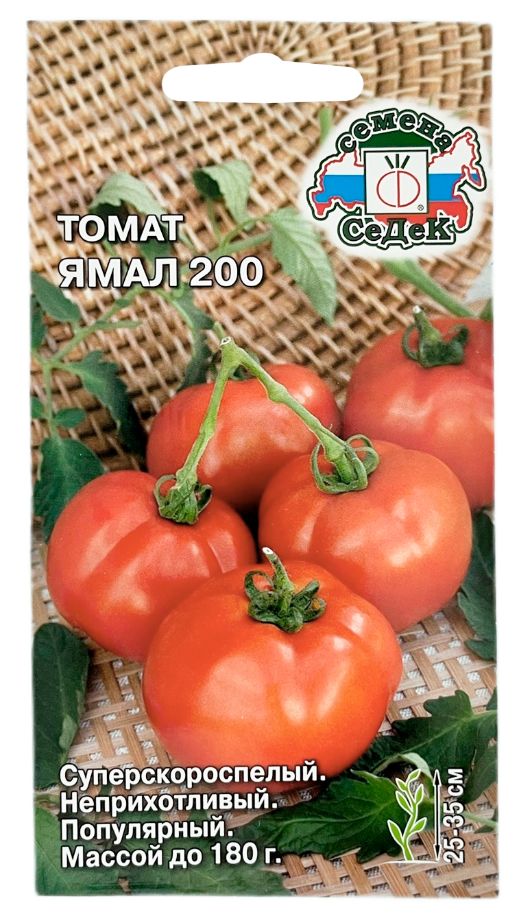 Томат ЯМАЛ 200 СеДеКСуперскороспелый (83-98 дней) сорт для открытого грунта и пленочных укрытий. Подходит для выращивания безрассадным способом в северных регионах и зонах рискованного земледелия. Растение штамбовое, высотой 25-35 см. Плоды округлые, красные, массой 65-105 (до 180) г. Для получения суперраннего урожая необходимо удалить пасынки. При выращивании в защищенном грунте, дает урожай до 9-12 кг/м². Ценность сорта: стабильная урожайность, устойчивость к стрессам, «отдает» ypoжай до появления фитофтороза. Назначение универсальное.