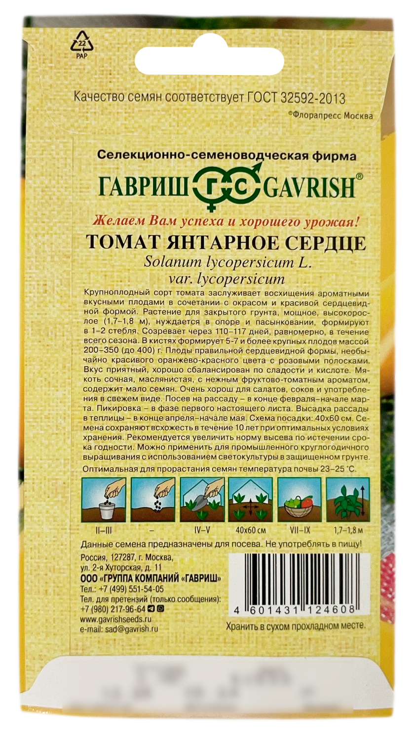 Томат ЯНТАРНОЕ СЕРДЦЕ ГАВРИШКрупноплодный, до 400г, урожаный томат. Вкусные, красивые плоды. Созревает через 110-117 дней, равномерно.