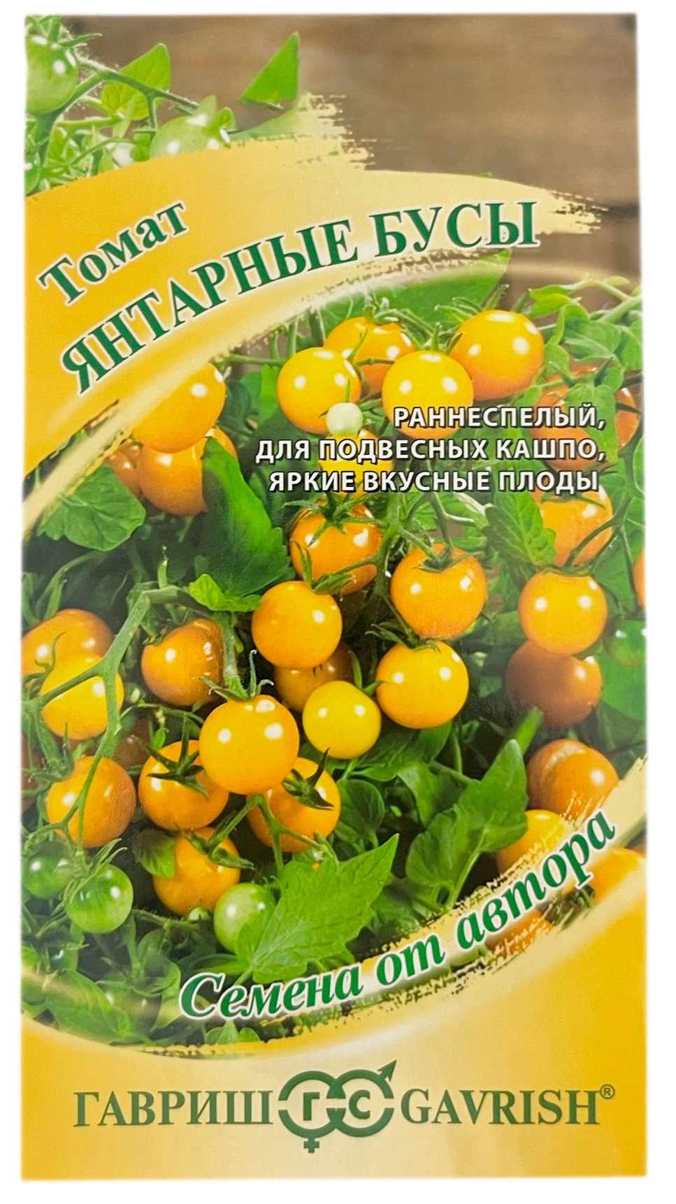 Томат ЯНТАРНЫЕ БУСЫ ГАВРИШЗамечательный раннеспелый (90-95 дней от всходов) сорт томата, селекции «Гавриш» ампельного типа для подвесных кашпо в летний период и для круглогодичного выращивания в комнатных условиях на подоконнике. В зимний период растение нуждается в досвечивание, плодоношение продолжается на новых побегах. Спелые плоды ярко-желтого цвета, округлой формы, массой 18-24 г. Средней плотности. Хорошего томатного вкуса. В длинной кисти содержатся от 15 и более штук. Сочные маленькие помидорки-черри, идеальны для употребления в свежем виде, салатов, закусок, для украшения стола. Посев на рассаду проводят в начале марта. Пикировка — в фазе первого настоящего листа. Подросшую хорошо сформированную рассаду высаживают в кашпо. Из расчета на кашпо размером 3л — 1 растение. Семена сохраняют всхожесть в течение 10 лет при оптимальных условиях хранения. Рекомендуется увеличить норму высева по окончании срока годности. Может применяться для промышленного круглогодичного выращивания с использованием светокультуры в защищенном грунте.