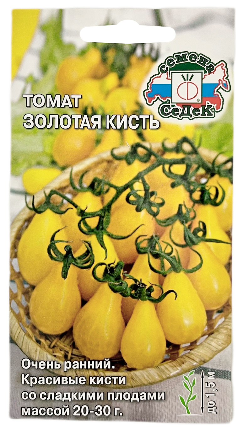 Томат ЗОЛОТАЯ КИСТЬ СеДеКОчень ранний (95-98 дней) сорт для пленочных теплиц и укрытий. Растение индетерминантное, сильнорослое, высотой до 1,5 м. Требует пасынкования и подвязки. Формирует ровные и очень красивые кисти. Плоды выравненные, грушевидные, золотисто-желтые, массой 20-30 г. плотные, сладкие. Ценность сорта: обильное и продолжительное плодоношение, отличные вкусовые качества. Рекомендуется для употребления в свежем виде, для цельноплодного консервирования, цветного овощного ассорти, украшения блюд.