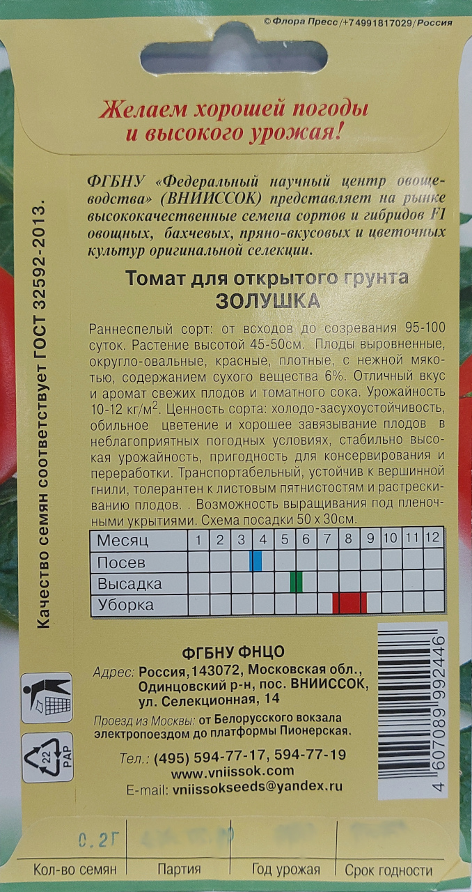 Томат для открытого грунта Золушка.Раннеспелый сорт: от всходов до созревания 95-100 суток. Растение высотой 45-50см. Плоды выровненные, округло-овальные, красные, плотные, с нежной мякотью, содержанием сухого вещества 6%. Отличный вкус и аромат свежих плодов и томатного сока. Урожайность 10-12 кг/м2. Ценность сорта: холодо-засухоустойчивость, обильное цветение и хорошее завязывание плодов в неблагоприятных погодных условиях, стабильно высокая урожайность, пригодность для консервирования и переработки. Транспортабельный, устойчив к вершинной гнили, толерантен к листовым пятнистостям и растрескиванию плодов. Возможность выращивания под пленочными укрытиями. Схема посадки 50 х 30см.