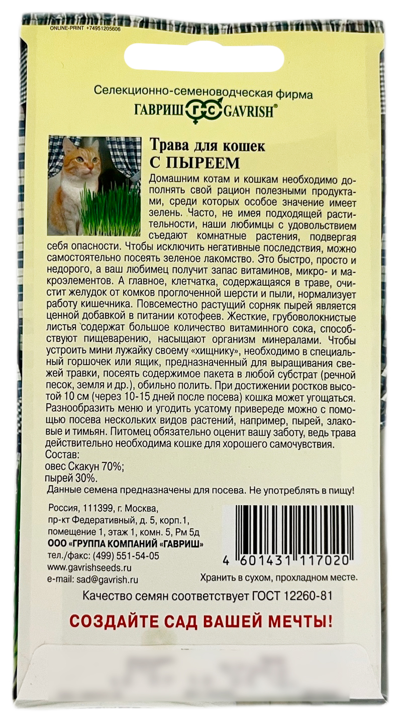 Трава для кошек с пыреем ГАВРИШДомашним котам и кошкам необходимо дополнять свой рацион полезными продуктами, среди которых особое значение имеет зелень. Часто котики, не имея подходящей растительности, с удовольствием грызут комнатные растения, подвергая себя опасности. Чтобы исключить негативные последствия, можно самостоятельно посеять зеленую вкусняшку. Это быстро, просто и недорого, а ваш любимец получит запас витаминов, микро- и макроэлементов. А главное, клетчатка, содержащаяся в травке, очистит желудок от комков проглоченной шерсти и пыли, нормализует работу кишечника. Повсеместно растущий сорняк пырей является ценной добавкой в питании котофеев. Жесткие, грубоволокнистые листья содержат большое количество витаминного сока, способствуют пищеварению, насыщают организм минералами. Чтобы устроить мини лужайку своему «хищнику», необходимо в специальный горшочек или ящик, предназначенный для выращивания свежей травки, посеять содержимое пакета в любой субстрат (речной песок, земля и др.), обильно полить. При достижении ростков высотой 10 см (через 10-15 дней после посева) кошка может угощаться. Разнообразить меню и угодить усатому привереде можно с помощью посева нескольких видов растений, например, пырей, злаковые и тимьян. Питомец обязательно оценит вашу заботу, ведь трава действительно необходима кошке для хорошего самочувствия Состав: овес Скакун 70%, пырей 30%.