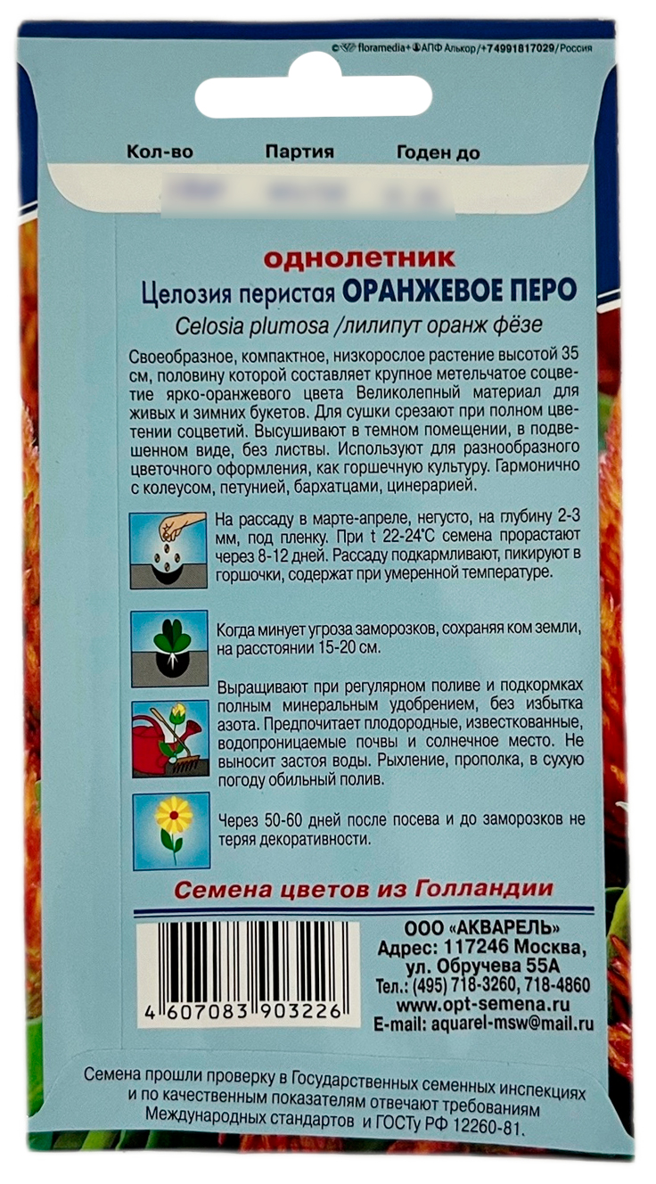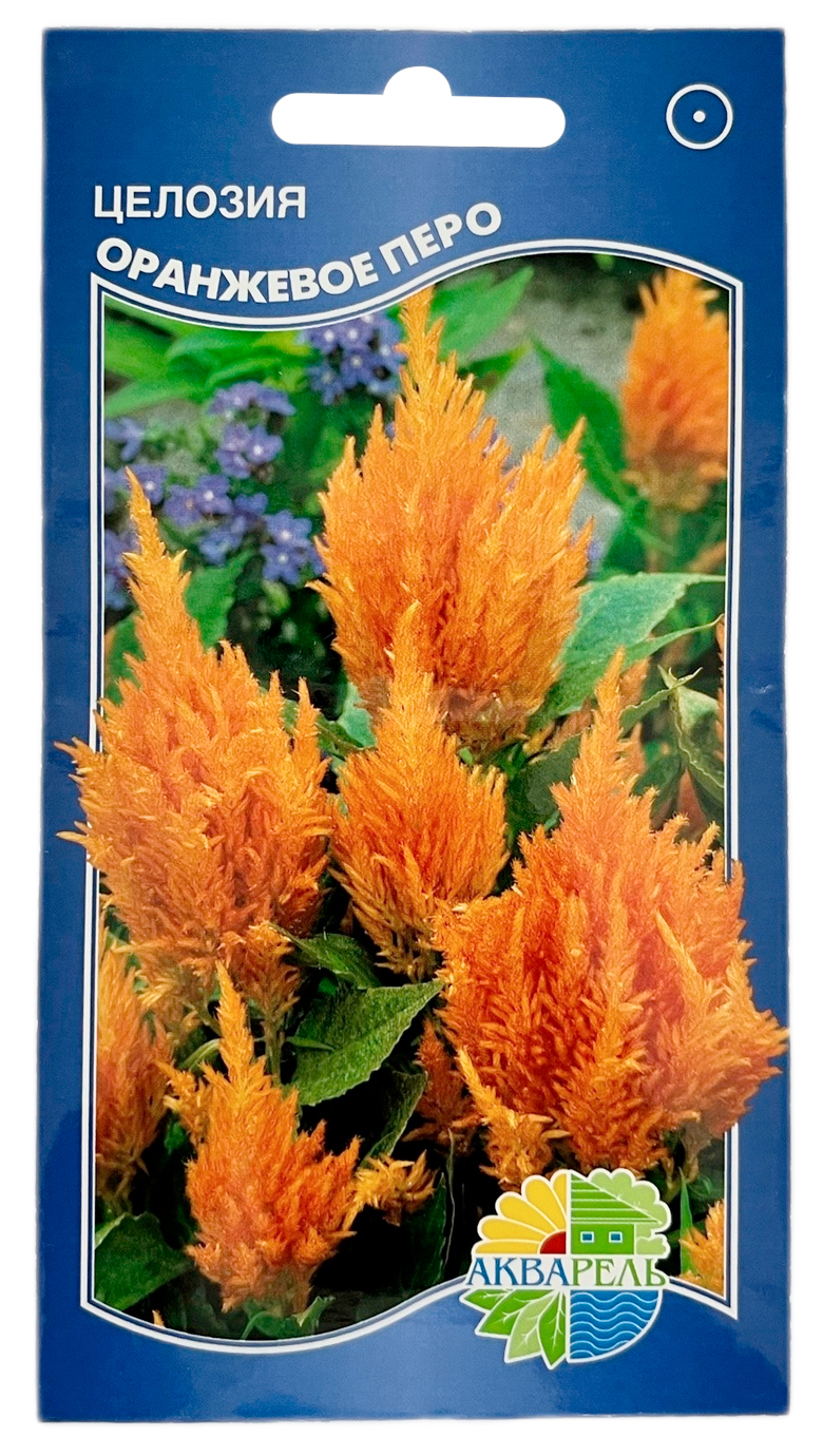 Целозия перистая ОРАНЖЕВОЕ ПЕРО АКВАРЕЛЬСвоеобразное, компактное, низкорослое растение высотой 35 см, половину которой составляет крупное метельчатое соцветие ярко-оранжевого цвета. Великолепный материал для живых и зимних букетов. Для сушки срезают при полном цветении соцветий. Высушивают в темном помещении, в подвешенном виде, без листвы. Используют для разнообразного цветочного оформления, как горшечную культуру. Гармонично с колеусом, петунией, бархатцами, цинерарией.