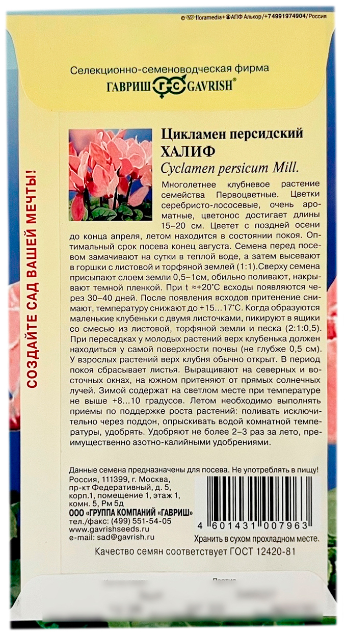 Цикламен персидский ХАЛИФ ГАВРИШМноголетнее клубневое растение семейства Первоцветные. Цветки серебристо-лососевые, очень ароматные, цветонос достигает длины 15 -20 см. Цветет с поздней осени до конца апреля, летом находится в состоянии покоя. Оптимальный срок посева конец августа. Семена перед посевом замачивают на сутки в теплой воде, а затем высевают в горшки с листовой и торфяной землей(1:1). Сверху семена присыпают слоем земли 0,5-1 см., обильно поливают, накрывают темной пленкой. При t 20 °C всходы появляются через 30-40 дней. После появления всходов притенение снимают, температуру снижают до 15-17 °C. Когда образуются маленькие клубеньки с двумя листочками, пикируют в ящики со смесью из листовой, торфяной земли и песка (2:1:0,5). При пересадках у молодых растений верх клубенька должен находиться у самой поверхности почвы (не глубже 0,5 см.). У взрослых растений верх клубня обычно открыт. В период покоя сбрасывает листья.