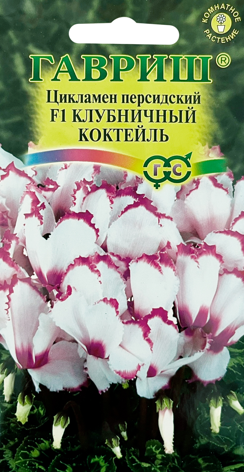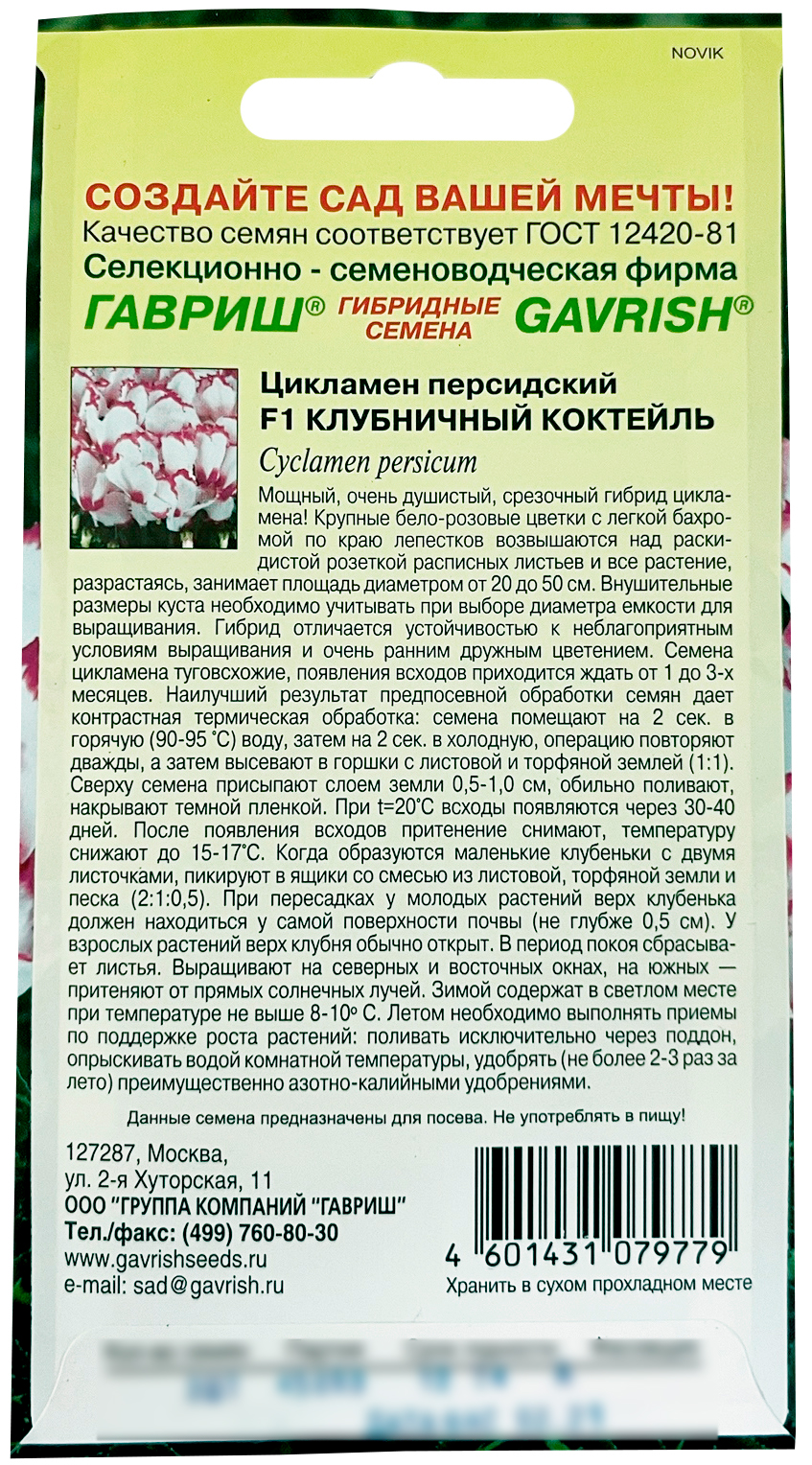 Цикламен персидский Клубничный коктейль F1 ГАВРИШ (Cyclamen persicum Mill.)Невероятно обильноцветущий гибрид! Из-за огромного числа благоухающих бело-розовых цветков, кажется, что одновременно цветет несколько растений, а не одно. Куст аккуратный, среднего размера с расписными листьями. Семена цикламена туговсхожие, появления всходов приходится ждать от 1 до 3-х месяцев. Наилучший результат предпосевной обработки семян дает контрастная термическая обработка: семена помещают на 2 сек. в горячую (90-95 °С) воду, затем на 2 сек. в холодную, операцию повторяют дважды, а затем высевают в горшки с листовой и торфяной землей (1:1). Сверху семена присыпают слоем земли 0,5-1,0 см, обильно поливают, накрывают темной пленкой. При t=20ºC всходы появляются через 30-40 дней. После появления всходов притенение снимают, температуру снижают до 15-17º С. Когда образуются маленькие клубеньки с двумя листочками, пикируют в ящики со смесью из листовой, торфяной земли и песка (2:1:0,5). При пересадках у молодых растений верх клубенька должен находиться у самой поверхности почвы (не глубже 0,5 см). У взрослых растений верх клубня обычно открыт. В период покоя сбрасывает листья. Выращивают на северных и восточных окнах, на южных — притеняют от прямых солнечных лучей. Зимой содержат в светлом месте при температуре не выше 8 - 10º С. Летом необходимо выполнять приемы по поддержке роста растений: поливать исключительно через поддон, опрыскивать водой комнатной температуры, удобрять (не более 2-3 раз за лето) преимущественно азотно-калийными удобрениями.