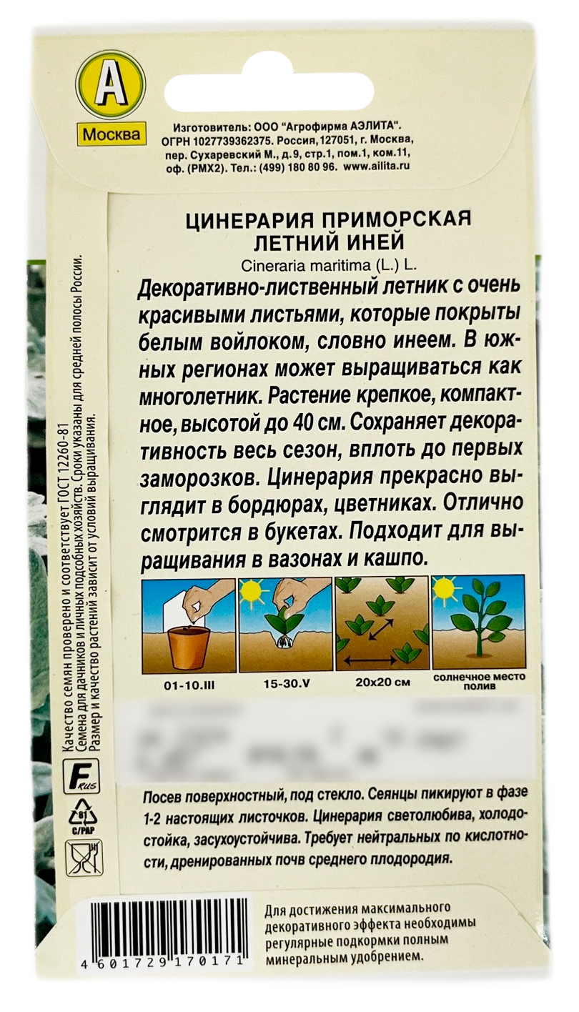 Цинерария приморская летний ИНЕЙ АЭЛИТАДекоративно-лиственный летник с очень красивыми листьями, которые покрыты белым войлоком, словно инеем. В южных регионах может выращиваться как многолетник. Растение крепкое, компактное, высотой до 40 см. Сохраняет декоративность весь сезон, вплоть до первых заморозков. Цинерария прекрасно вы глядит в бордюрах, цветниках. Отлично смотрится в букетах. Подходит для выращивания в вазонах и кашпо.