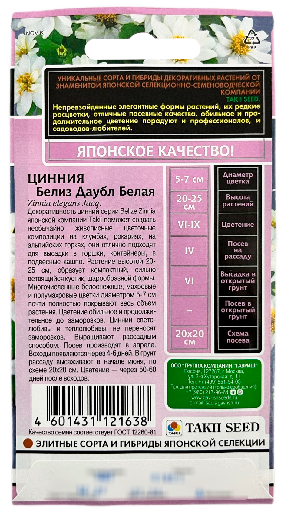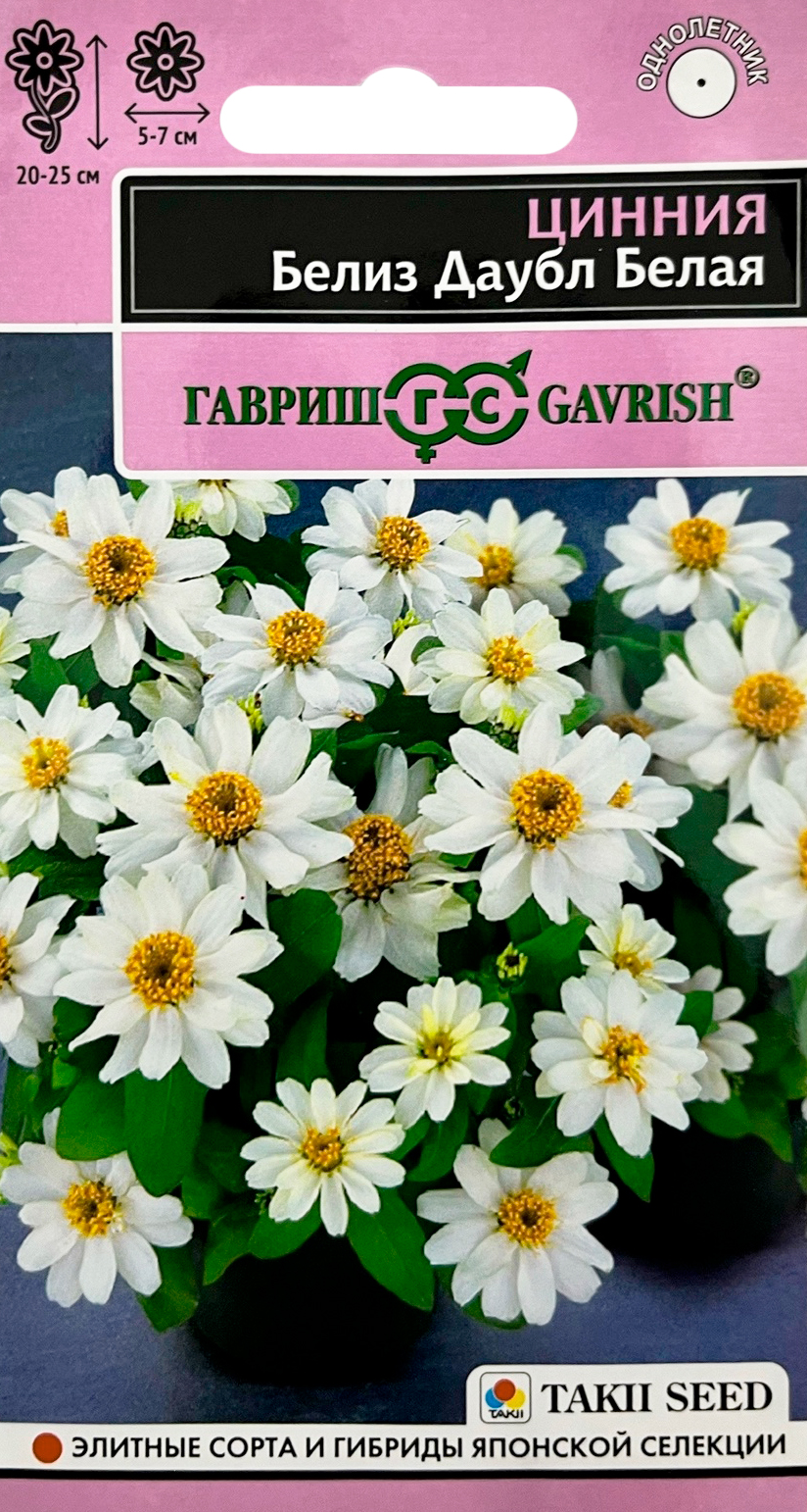 Цинния Белиз даубл белая (Zinnia elegans Jacq) серия Эксклюзив Н24 (Zinnia elegans Jacq.)Декоративность цинний серии Belize Zinnia японской компании Takii поможет создать необычайно живописные цветочные композиции на клумбах, рокариях, на альпийских горках, они отлично подходят для высадки в горшки, контейнеры, в подвесные кашпо. Растение высотой 20-25 см, образует компактный, сильно ветвящийся кустик, шарообразной формы. Многочисленные белоснежные, махровые и полумахровые цветки диаметром 5-7 см почти полностью покрывают весь объем растения. Цветение обильное и продолжительное до заморозков. Циннии светолюбивы и теплолюбивы не переносят заморозков. Выращивают рассадным способом. Посев производят в апреле. Всходы появляются через 4-6 дней. В грунт рассаду высаживают в начале июня, по схеме 20х20 см. Цветение — через 50-60 дней после всходов.