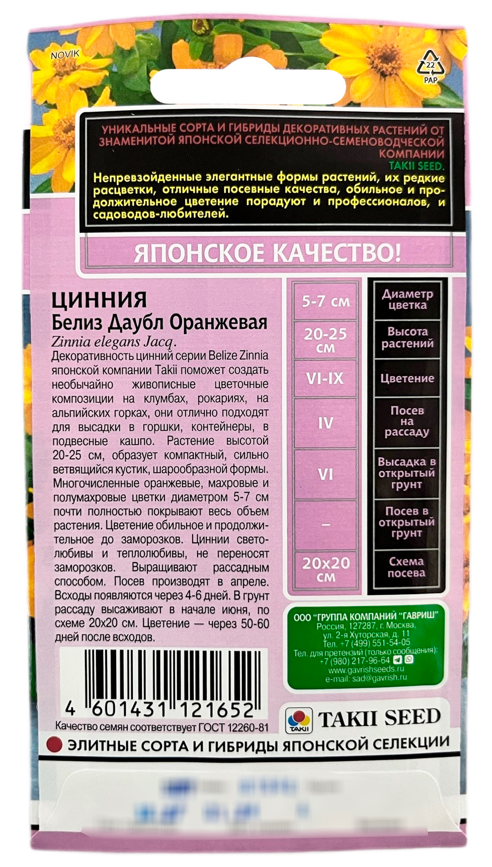 Цинния Белиз даубл оранжевая (Zinnia elegans Jacq) серия Эксклюзив Н24 (Zinnia elegans Jacq.)Декоративность цинний серии Belize Zinnia японской компании Takii поможет создать необычайно живописные цветочные композиции на клумбах, рокариях, на альпийских горках, они отлично подходят для высадки в горшки, контейнеры, в подвесные кашпо. Растение высотой 20-25 см, образует компактный, сильно ветвящийся кустик, шарообразной формы. Многочисленные оранжевые, махровые и полумахровые цветки диаметром 5-7 см почти полностью покрывают весь объем растения. Цветение обильное и продолжительное до заморозков. Циннии светолюбивы и теплолюбивы не переносят заморозков. Выращивают рассадным способом. Посев производят в апреле. Всходы появляются через 4-6 дней. В грунт рассаду высаживают в начале июня, по схеме 20х20 см. Цветение — через 50-60 дней после всходов.