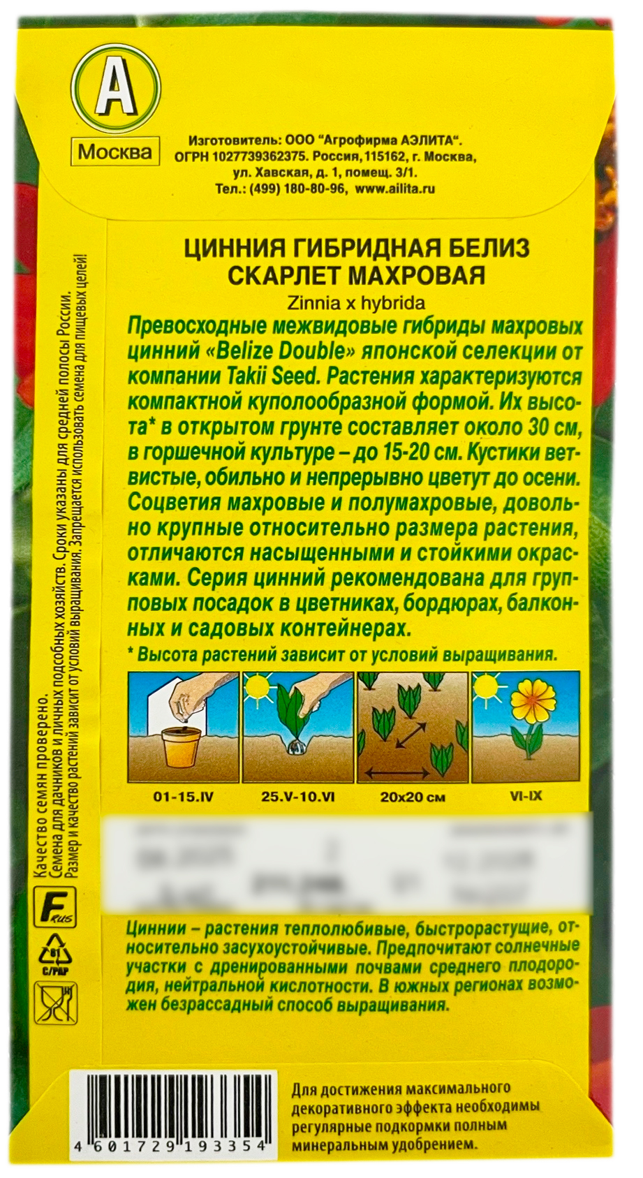 Цинния гибридная БЕЛИЗ скарлет махровая АЭЛИТАПревосходные межвидовые гибриды махровых цинний «Belize Double» японской селекции от компании Takii Seed. Растения характеризуются компактной куполообразной формой. Их высота* в открытом грунте составляет около 30 см, в горшечной культуре – до 15-20 см. Кустики ветвистые, обильно и непрерывно цветут до осени. Соцветия махровые и полумахровые, довольно крупные относительно размера растения, отличаются насыщенными и стойкими окрасками. Серия цинний рекомендована для групповых посадок в цветниках, бордюрах, балконных и садовых контейнерах.