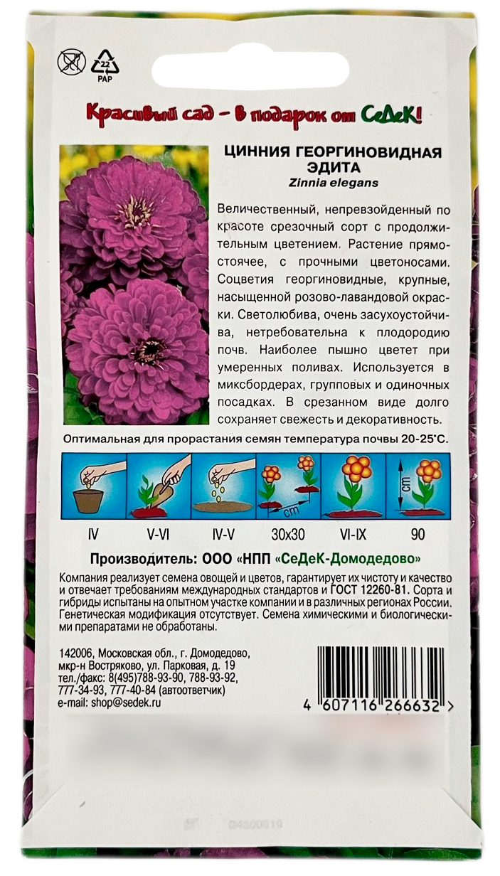 Цинния Эдита СеДеКВеличественный, непревзойденный по красоте срезочный сорт с продолжительным цветением. Растение прямостоячее, с прочными цветоносами. Соцветия георгиновидные, крупные, насыщенной розово-лавандовой окраски. Светолюбива, очень засухоустойчива, нетребовательна к плодородию почв. Наиболее пышно цветет при умеренных поливах. Используются в миксбордерах, групповых и одиночных посадках. В срезанном виде долго сохраняет свежесть и декоративность.
