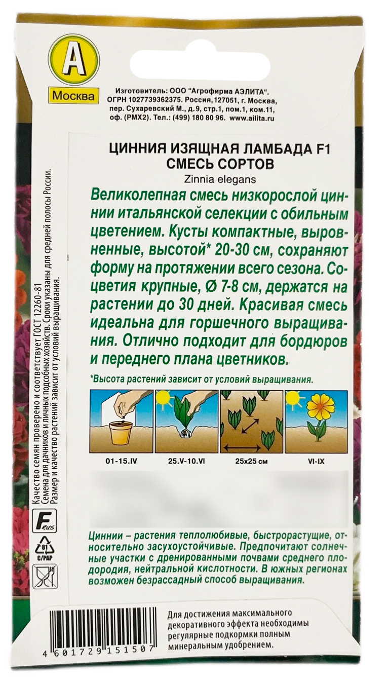 Цинния изящная ЛАМБАДА F1 смесь АЭЛИТАВеликолепная cмесь низкорослой циннии с обильным цветением от итальянской компании Farao. Кусты компактные, выровненные, высотой около 20 см, сохраняют форму на протяжении всего сезона. Соцветия крупные, Ø 7 см, держатся на растении до 30 дней. Красивая смесь идеальна для горшечного выращивания. Отлично подходит для бордюров и переднего плана цветников.