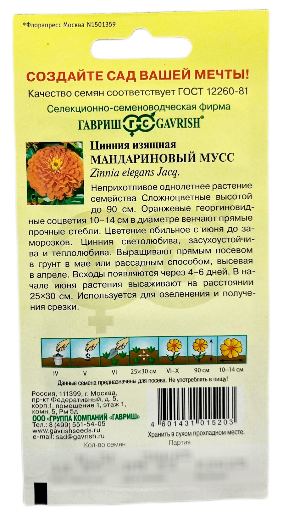 Цинния изящная Мандариновый мусс ГАВРИШНеприхотливое однолетнее растение семейства Сложноцветные высотой до 90 см. Цветение обильное с июня до заморозков. Оранжевые георгиновидные соцветия 10 -14 см в диаметре венчают прямые прочные стебли. Светолюбива, засухоустойчива и теплолюбива. Выращивают рассадным способом. Семена высевают в апреле. Всходы появляются через 4-6 дней. В начале июня растения высаживают на расстоянии 25-30 см. цветение. Используется для озеленения и получения срезки.