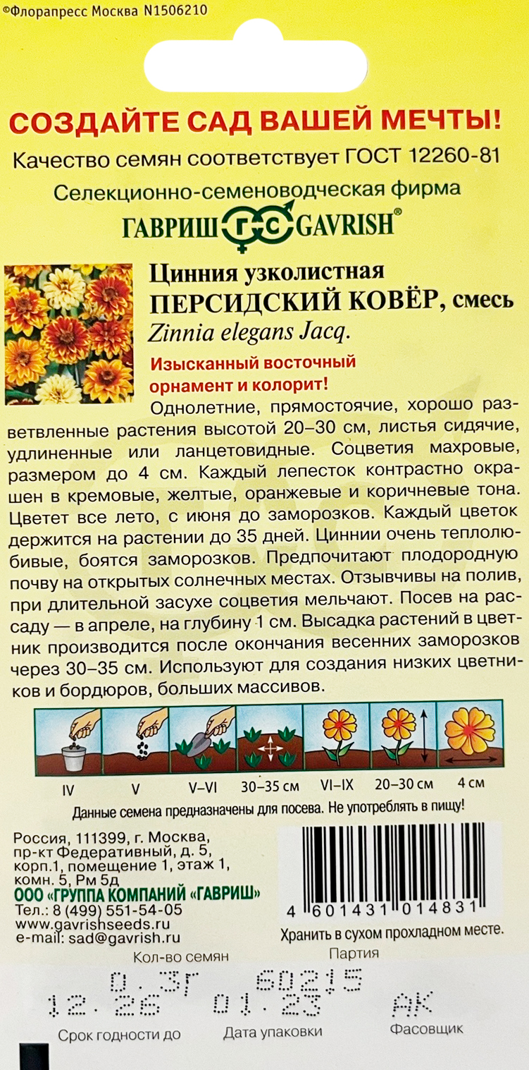 Цинния Персидский ковер узколистнаяОднолетние, прямостоячие, хорошо разветвленные растения высотой 20-30 см, листья сидячие, удлиненные или ланцетовидные. Соцветия махровые, размером до4 см. Каждый «лепесток» контрастно окрашен в кремовых, желтых, оранжевых и коричневых тонах. Цветет все лето, с июня до заморозков. Каждый цветок держится на растении до 35 дней. Циннии очень теплолюбивые, боятся заморозков. Предпочитают плодородную почву на открытых солнечных местах. Отзывчивы на полив, при длительной засухе соцветия мельчают. Посев на рассаду в апреле, на глубину1 см. Высадка растений в цветник производится после окончания весенних заморозков через 30-35 см. Используют для создания низких цветников и бордюров, больших массивах.
