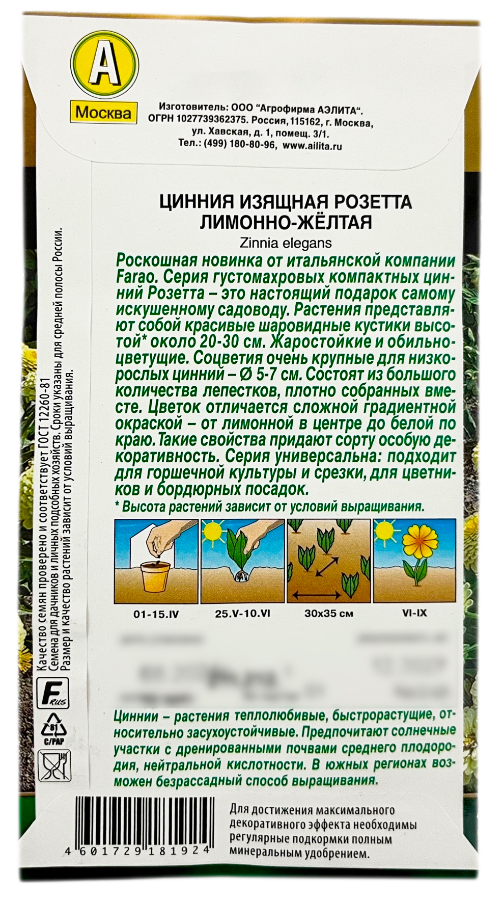 Цинния изящная РОЗЕТТА лимонно-жёлтая АЭЛИТАРоскошная новинка от итальянской компании Farao. Серия густомахровых компактных цинний Розетта – это настоящий подарок самому искушенному садоводу. Растения представляют собой красивые шаровидные кустики высотой* около 20-30 см. Жаростойкие и обильноцветущие. Соцветия очень крупные для низкорослых цинний – Ø 5-7 см. Состоят из большого количества лепестков, плотно собранных вместе. Цветок отличается сложной градиентной окраской – от лимонной в центре до белой по краю. Такие свойства придают сорту особую декоративность. Серия универсальна: подходит для горшечной культуры и срезки, для цветников и бордюрных посадок.