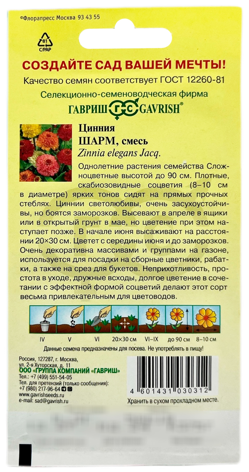 Цинния ШармОднолетние растения семейства Сложноцветные высотой до 90 см. Плотные, скабиозовидные соцветия (8-10 см в диаметре) ярких тонов сидят на прямых прочных стеблях. Циннии светолюбивы, очень засухоустойчивы, но боятся заморозков. Высевают в апреле в ящики или в открытый грунт в мае, но цветение при этом наступает позже. В начале июня высаживают на расстоянии 20х30 см. Цветет с середины июня и до заморозков. Очень декоративна массивами и группами на газоне, используется для посадки на сборные цветники, рабатки, а также на срез для букетов. Неприхотливость, простота в уходе, дружные всходы, долгое цветение в сочетании с эффектной формой соцветий делают этот сорт весьма привлекательным для цветоводов.