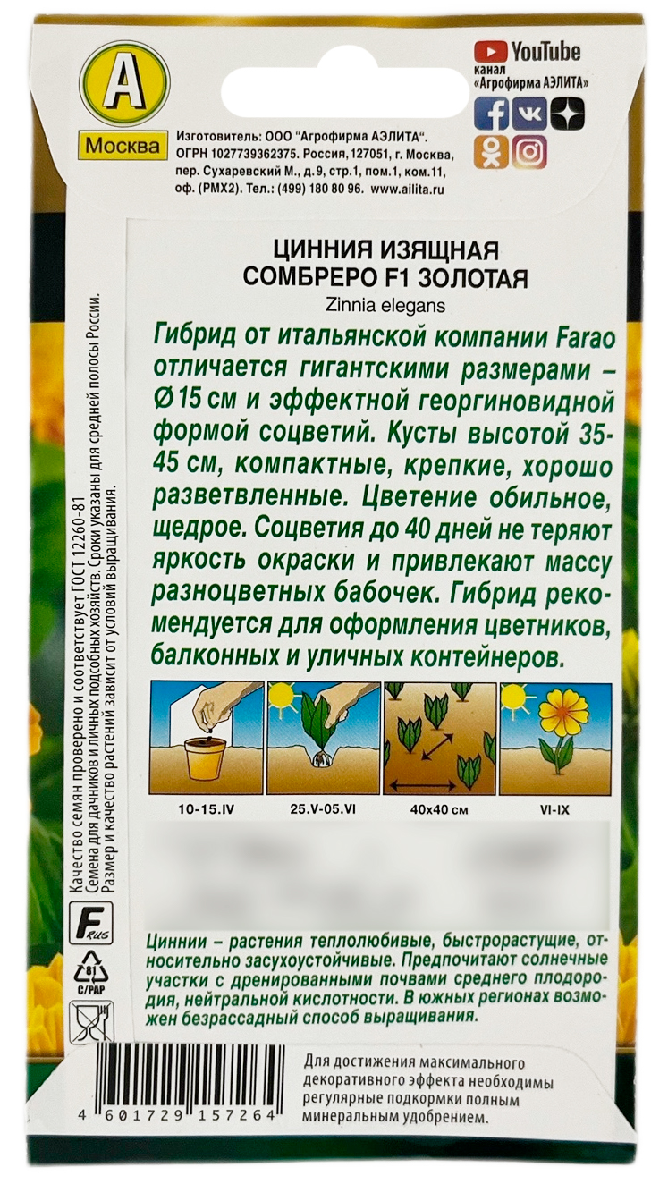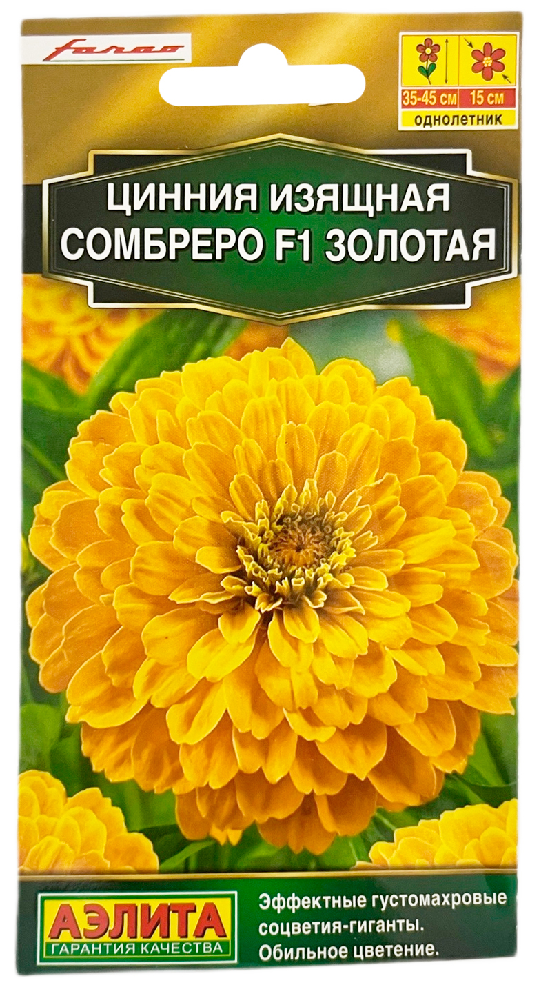 Цинния изящная СОМБРЕРО F1 золотая АЭЛИТАСерия гибридов иностранной селекции Сомбреро отличается гигантскими размерами (диаметром 10-12 см) и эффектной георгиновидной формой соцветий. Кусты высотой 35-45 см, компактные, крепкие, хорошо разветвленные. Цветение обильное, щедрое. Соцветия до 40 дней не теряют яркость окраски и привлекают массу разноцветных бабочек. Гибрид рекомендуется для оформления цветников, балконных и уличных контейнеров.