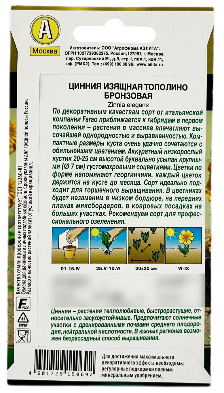 Цинния изящная ТОПОЛИНО бронзовая АЭЛИТАСорт ТОПОЛИНО от итальянской компании Farao по декоративным качествам приближается к гибридам в первом поколении – растения в массиве впечатляют высочайшей однородностью и выравненностью. Компактные размеры куста очень удачно сочетаются с обильнейшим цветением. Аккуратный низкорослый кустик 20-25 см высотой буквально усыпан крупными (Ø 7 см) густомахровыми соцветиями. Цветки по форме напоминают георгинчики, каждый цветок держится на кусте до месяца. Сорт идеально подходит для горшечного выращивания. В цветниках будет незаменим в низком бордюре, на передних планах миксбордеров, в ковровых посадках на больших участках. Рекомендуем сорт для профессионального озеленения.