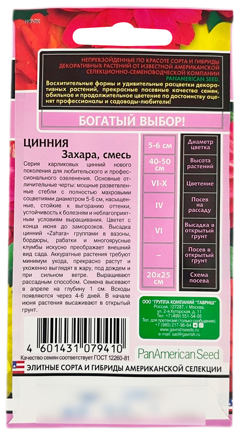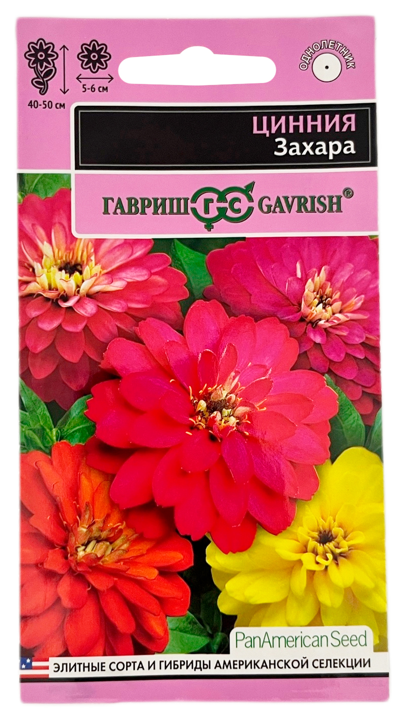 Цинния ЗАХАРА смесь ГАВРИШСерия карликовых цинний нового поколения для любительского и профессионального озеленения. Основные отличительные черты: мощные разветвлённые стебли с полностью махровыми соцветиями диаметром 5-6 см, насыщенные стойкие к выгоранию оттенки, устойчивость к болезням и неблагоприятным условиям выращивания. Цветет с конца июня до заморозков. Высадка цинний «Zahara» группами в вазоны, бордюры, рабатки и многоярусные клумбы, искусно преображает внешний вид сада. Аккуратные кустики требуют минимум ухода, прекрасно растут и ухоженно выглядят в жару, под дождем и при сильном ветре. Выращивают рассадным способом. Семена высевают в апреле на глубину 1 см. Всходы появляются через 4-6 дней. В начале июня растения высаживают в открытый грунт.