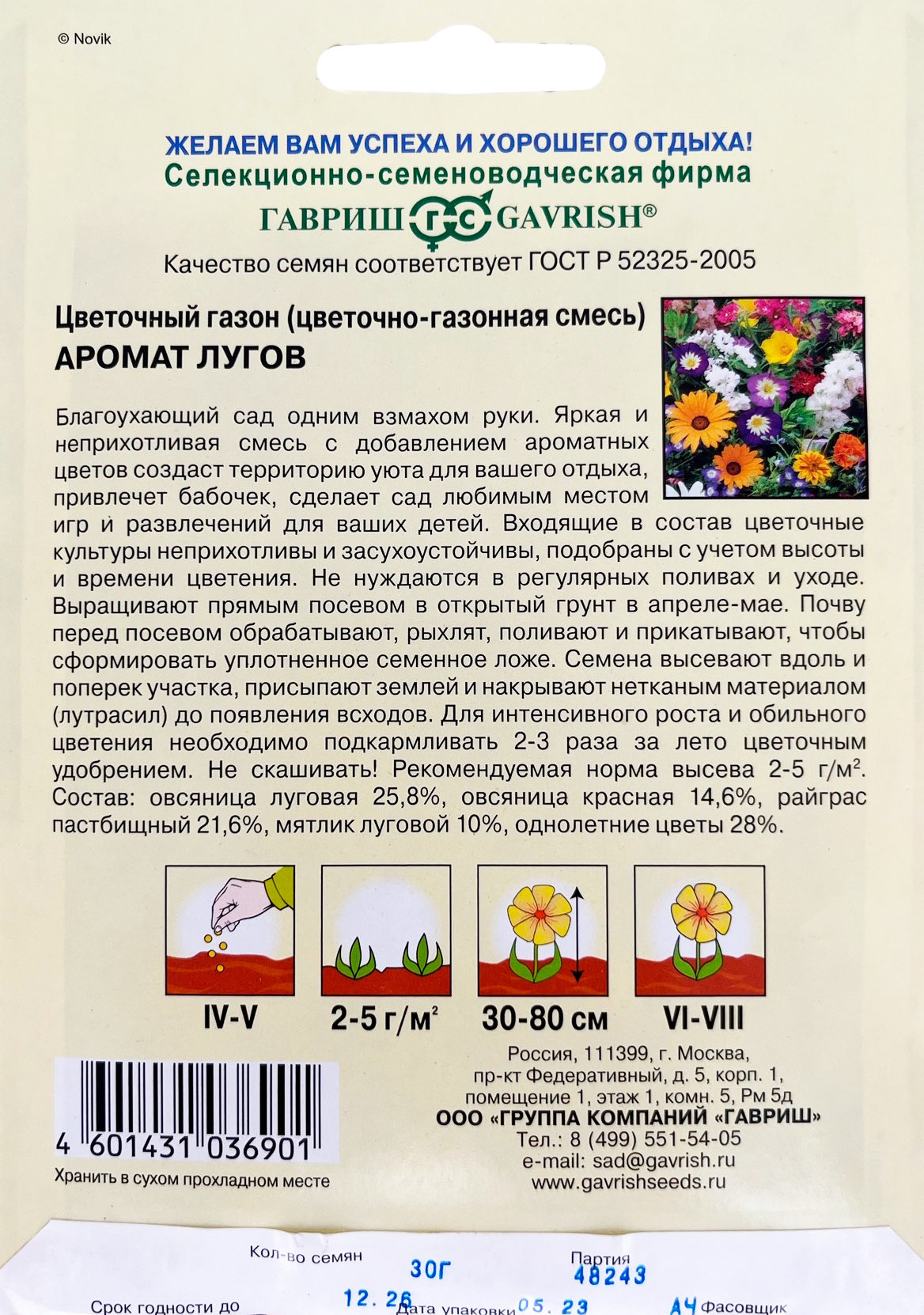 Цветочный газон Аромат лугов 30 гБлагоухающий сад одним взмахом руки. Яркая и неприхотливая смесь газонных трав с добавлением ароматных цветов создаст территорию уюта для вашего отдыха, привлечет бабочек, сделает сад любимым местом игр и развлечений для ваших детей. Входящие в состав газона цветочные многолетние и однолетние культуры неприхотливы и засухоустойчивы, подобраны с учетом высоты и времени цветения. Не нуждаются в регулярных поливах и уходе. Выращивают прямым посевом в открытый грунт в апреле — мае. Почву перед посевом обрабатывают, рыхлят, поливают и прикатывают, чтобы сформировать уплотненное семенное ложе. Семена высевают вдоль и поперек участка, присыпают землей и накрывают нетканным материалом (лутрасил) до появления всходов. Для интенсивного роста и обильного цветения необходимо подкармливать 2-3 раза за лето цветочным удобрением. Не скашивать. Рекомендуемая норма высева 2-5 г/м.
