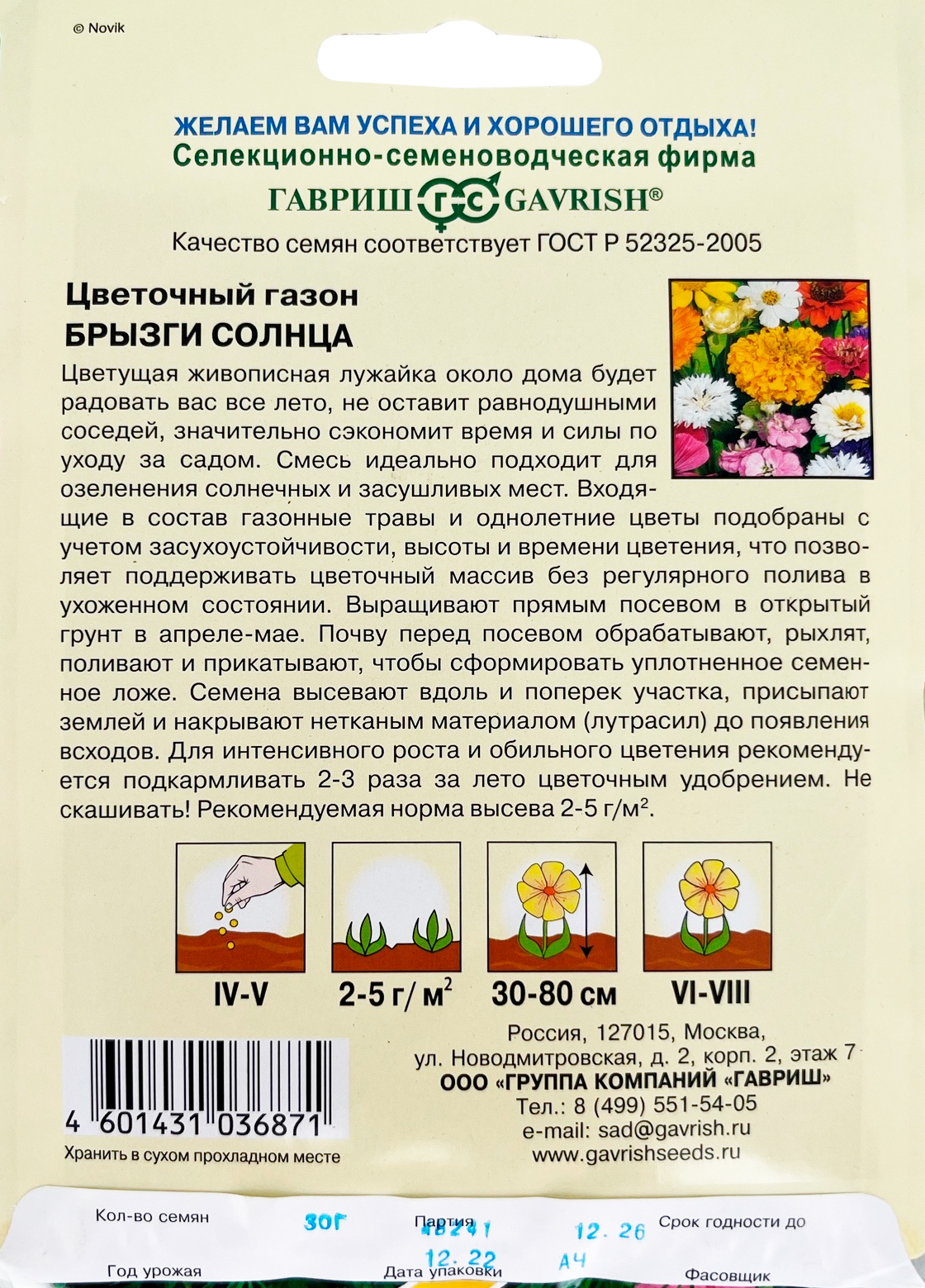 Цветочный газон Брызги солнца 30,0 гЦветущая, живописная лужайка около дома будет радовать Вас все лето, не оставит равнодушными соседей, значительно сэкономит время и силы по уходу за садом. Смесь из газонных трав и цветочных культур идеально подходит для озеленения солнечных и засушливых мест. Входящие в состав однолетние и многолетние цветы подобраны с учетом засухоустойчивости, высоты и времени цветения, что позволяет поддерживать цветочный массив без регулярного полива в ухоженном состоянии. Выращивают прямым посевом в открытый грунт в апреле — мае. Почву перед посевом обрабатывают, рыхлят, поливают и прикатывают, чтобы сформировать уплотненное семенное ложе. Семена высевают вдоль и поперек участка, присыпают землей и накрывают нетканным материалом (лутрасил) до появления всходов. Для интенсивного роста и обильного цветения рекомендуется подкармливать 2-3 раза за лето цветочным удобрением. Не скашивать. Рекомендуемая норма высева 2-5 г/м.