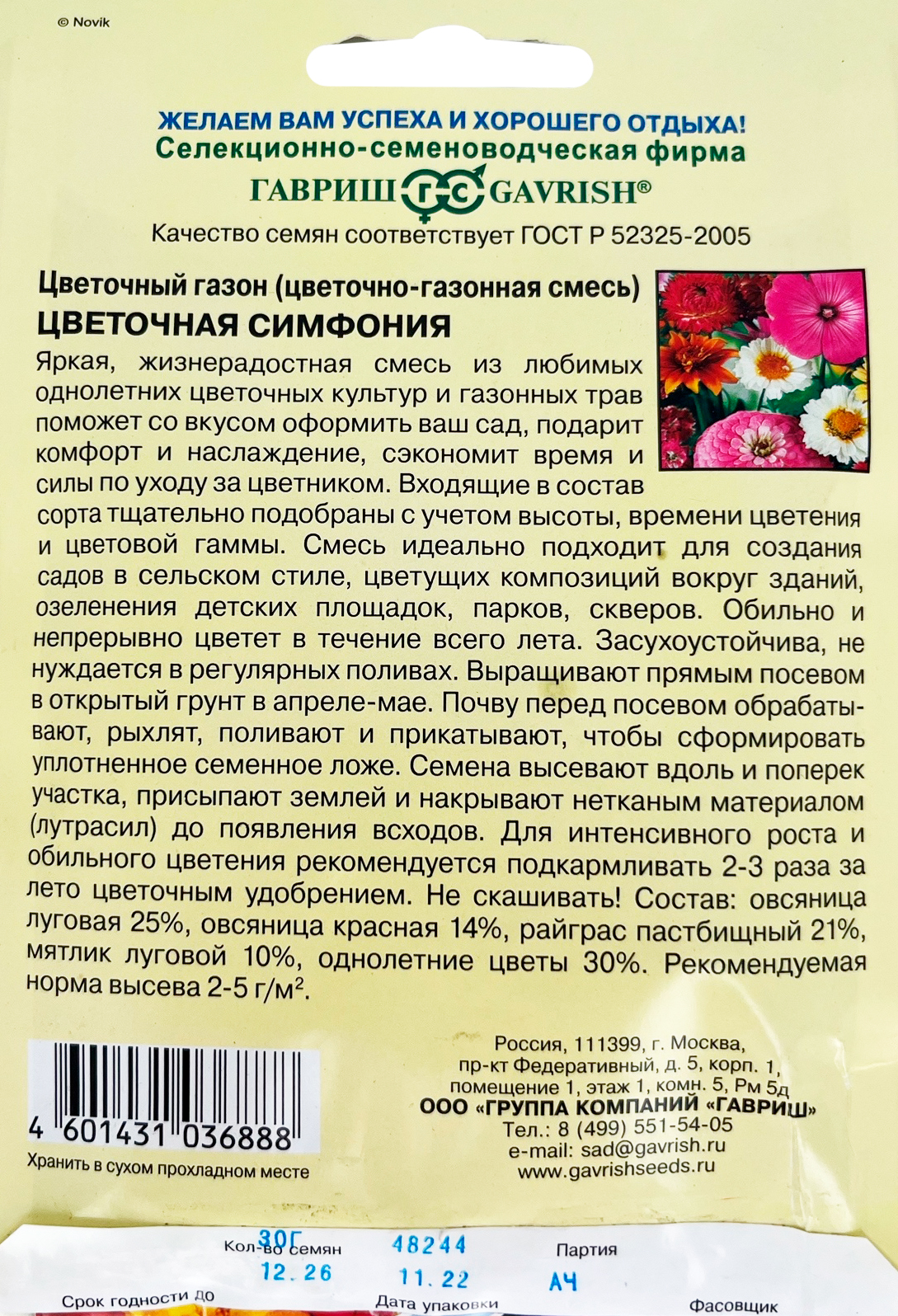 Цветочный газон Цветочная симфония 30,0 г Н11Яркий, жизнерадостный газон из любимых однолетних и многолетних цветочных культур поможет со вкусом оформить Ваш сад, подарит комфорт и наслаждение, сэкономит время и силы по уходу за цветником. Входящие в состав сорта тщательно подобраны с учетом высоты, времени цветения и цветовой гаммы. Газон идеально подходит для создания садов в сельском стиле, цветущих композиций вокруг зданий, озеленения детских площадок, парков, скверов. Обильно и непрерывно цветет в течение всего лета. Засухоустойчива, не нуждается в регулярных поливах. Выращивают прямым посевом в открытый грунт в апреле — мае. Почву перед посевом обрабатывают, рыхлят, поливают и прикатывают, чтобы сформировать уплотненное семенное ложе. Семена высевают вдоль и поперек участка, присыпают землей и накрывают нетканным материалом (лутрасил) до появления всходов. Для интенсивного роста и обильного цветения рекомендуется подкармливать 2-3 раза за лето цветочным удобрением. Не скашивать. Рекомендуемая норма высева 2-5 г/м.
