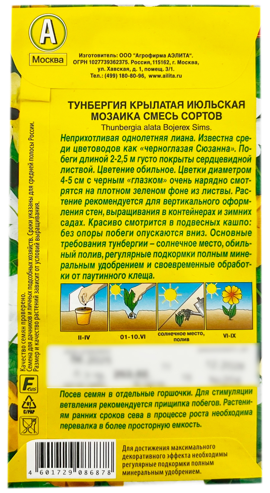 Тунбергия крылатая ИЮЛЬСКАЯ МОЗАИКА смесь сортов АЭЛИТАОднолетняя лиана с побегами длиной 2-2,5 м, густо покрытыми сердцевидной листвой и цветками Ø 4-5 см. Неприхотливость, обильное цветение в открытом грунте с конца июня до сентября и возможность использования в вертикальной и ампельной культуре с каждым новым сезоном увеличивают число её поклонников. Хорошо чувствует себя на балконах и как комнатное растение. Её основные требования – солнечное местоположение, обильный, но не чрезмерный полив, почва легкого мехсостава, защита от ветров, регулярные подкормки полным минеральным удобрением и своевременные обработки от паутинного клеща.