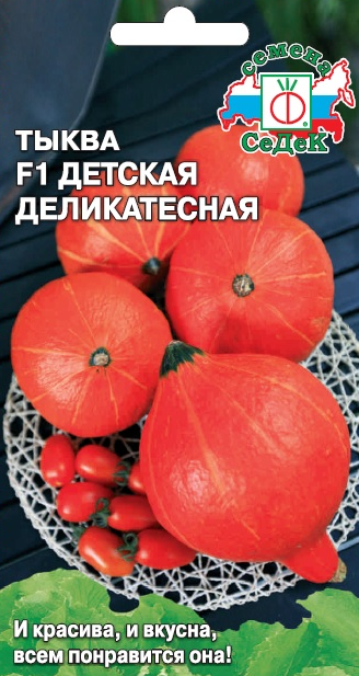 Тыква Детская деликатеснаяСреднеспелый (110-115 дней) сорт столового назначения. Растение плетистое, с многочисленными, мелкими, порционными плодами. Плоды плоскоокруглые, массой 3,0 кг, оранжевые, с темно-зелёными полосками, с плотной, сочной, зеленовато-оранжевой, сладкой мякотью. Урожайность 8-10 кг/раст. Ценность сорта: порционность, высокие товарные, потребительские и вкусовые качества плодов, с хорошими кулинарными, диетическими и лечебными свойствами. Рекомендуется для употребления в свежем виде, для домашней кулинарии, для вяления и сушки, незаменима в детском питании.
