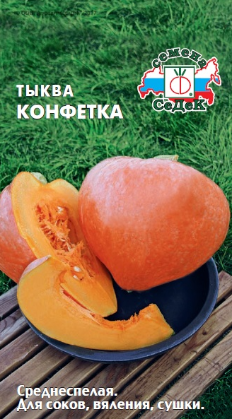 Тыква КонфеткаСреднеспелый (от всходов до сбора урожая 115-120 дней) сорт порционной тыквы столового назначения. Растение плетистое, одновременно формирует до 6 плодов. Плоды округлые, темно-красные, с единичными зелеными пятнами, массой 1,5-2 кг. Мякоть красно-оранжевая, хрустящая, плотная, сочная, сладкая. Ценность сорта: устойчивость к основным заболеваниям Тыквенных, высокое содержание каротина, диетические и лечебные свойства. Рекомендуется для употребления в свежем виде, для домашней кулинарии, приготовления соков, вяления, сушки.